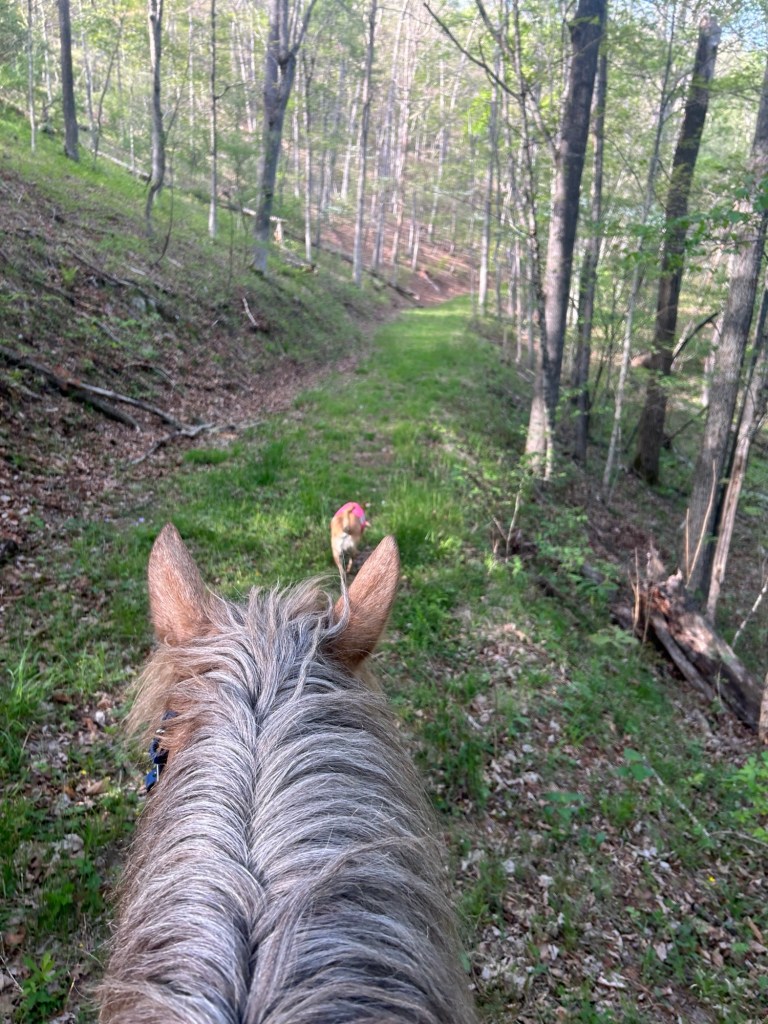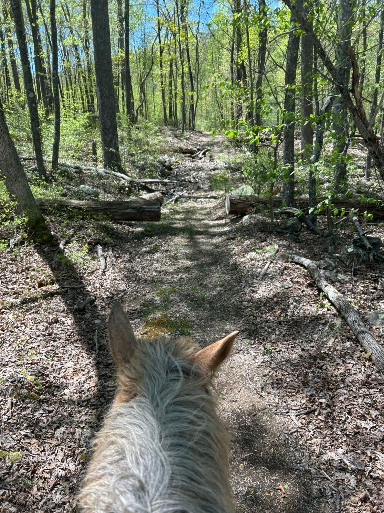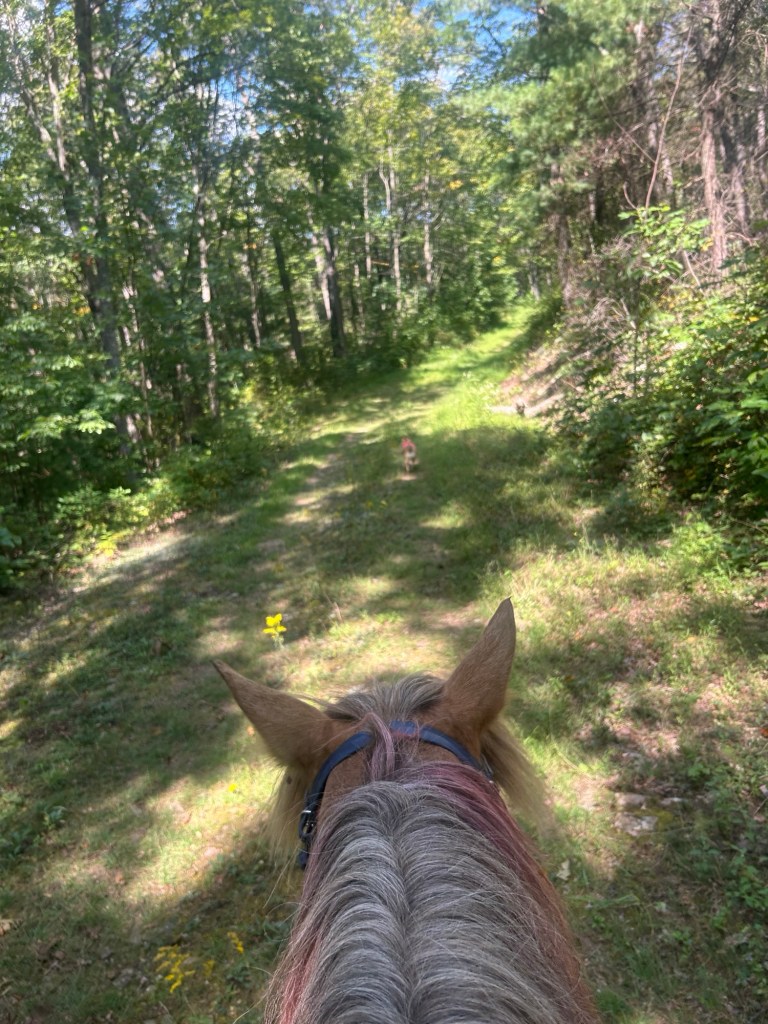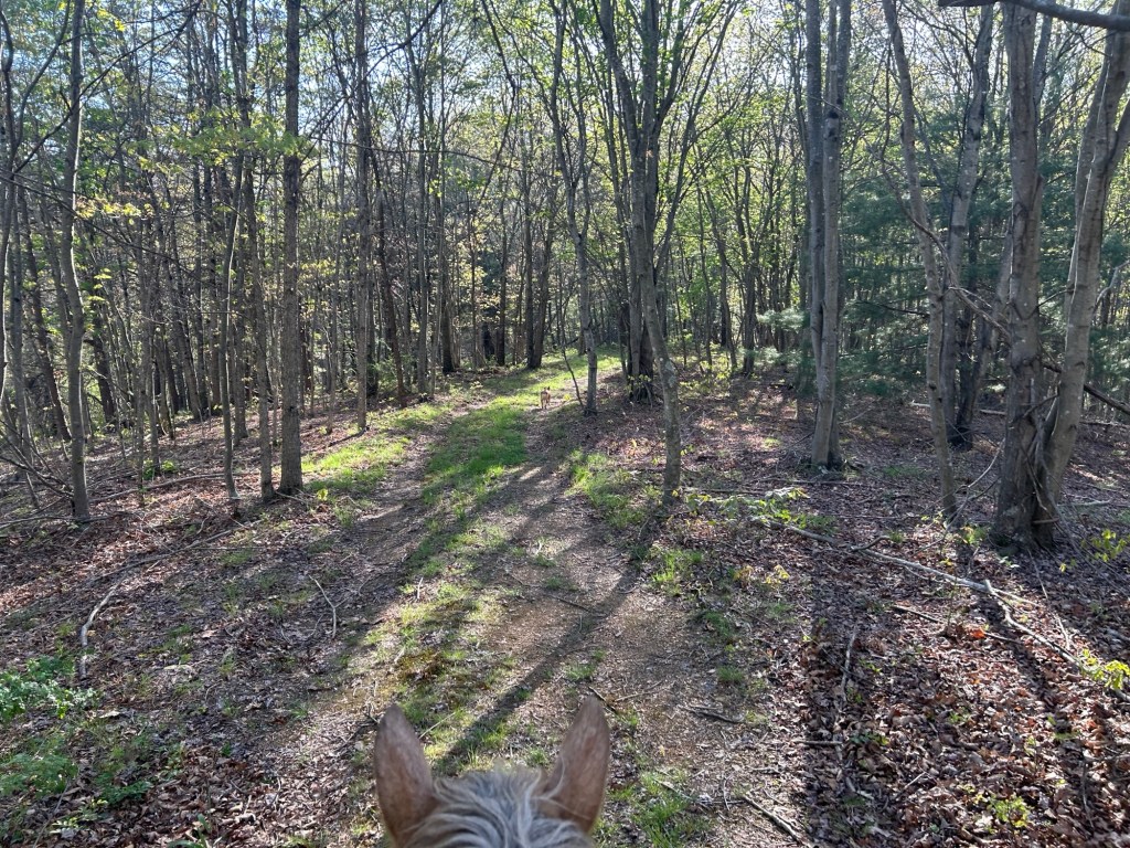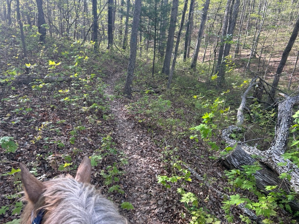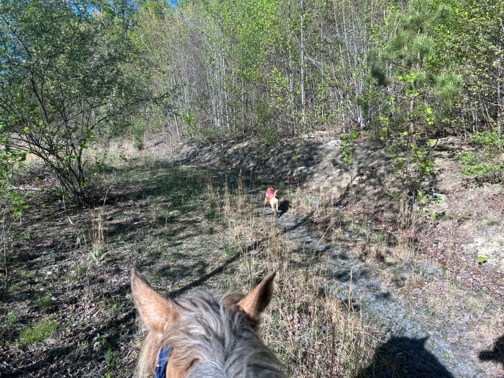 The trail went up hill for a short bit. There was a tree down on the trail. I sawed through the top branch with my hand saw. But then I was unable to move that section enough to get Simon over the bottom branch. And I was out of energy to saw another branch. This made me question how the other horse got through (why did it take me this long to think about that) and then I noticed a pushed down brush area a bit behind Simon. Obvi I took that route. The over growth on either side was pretty dense.