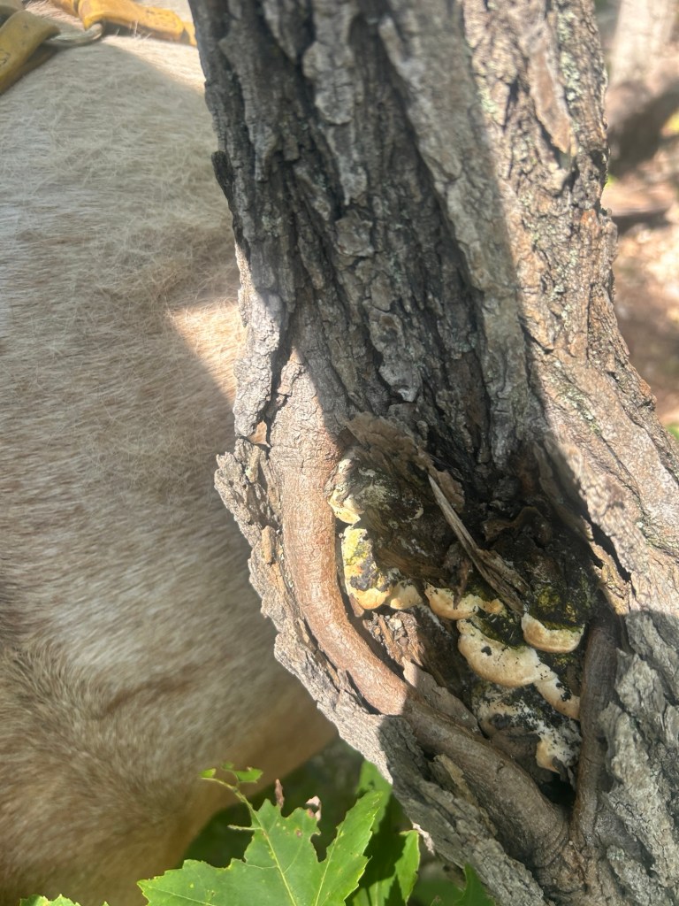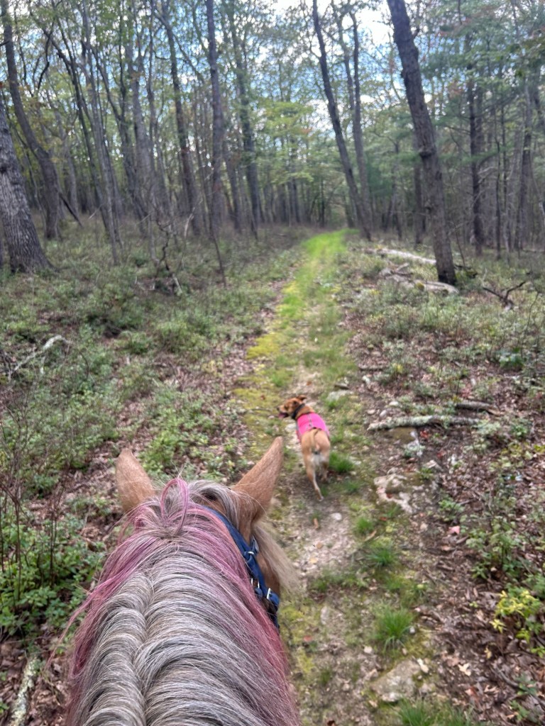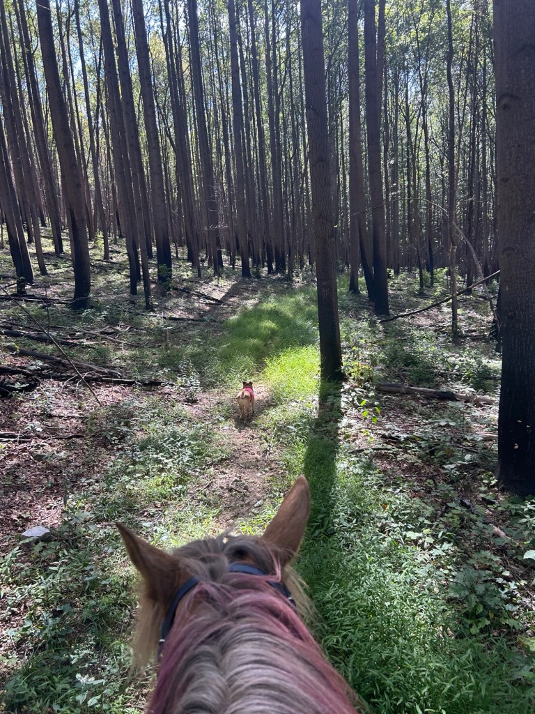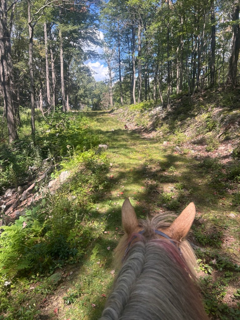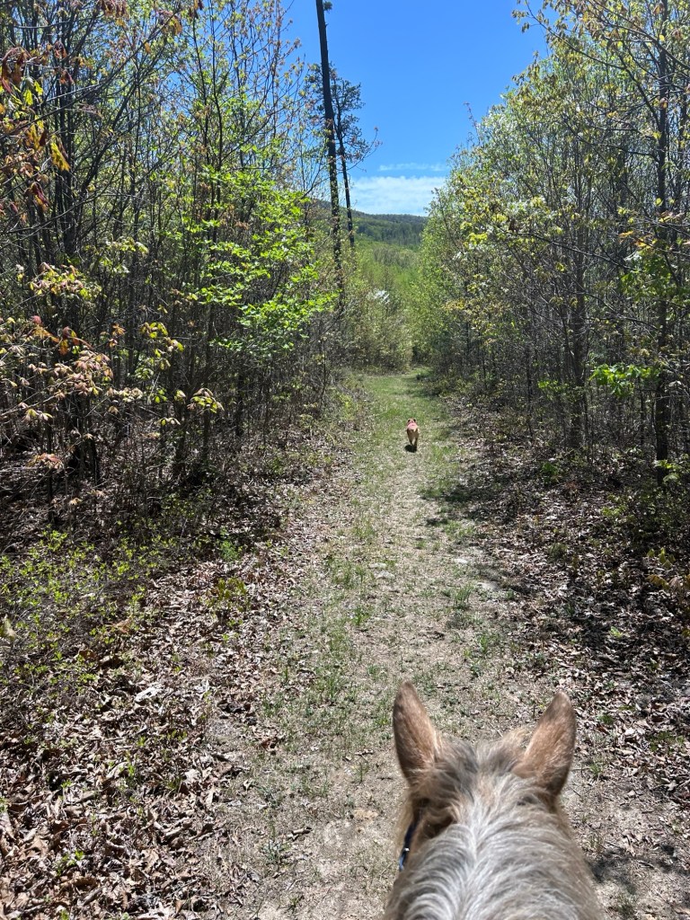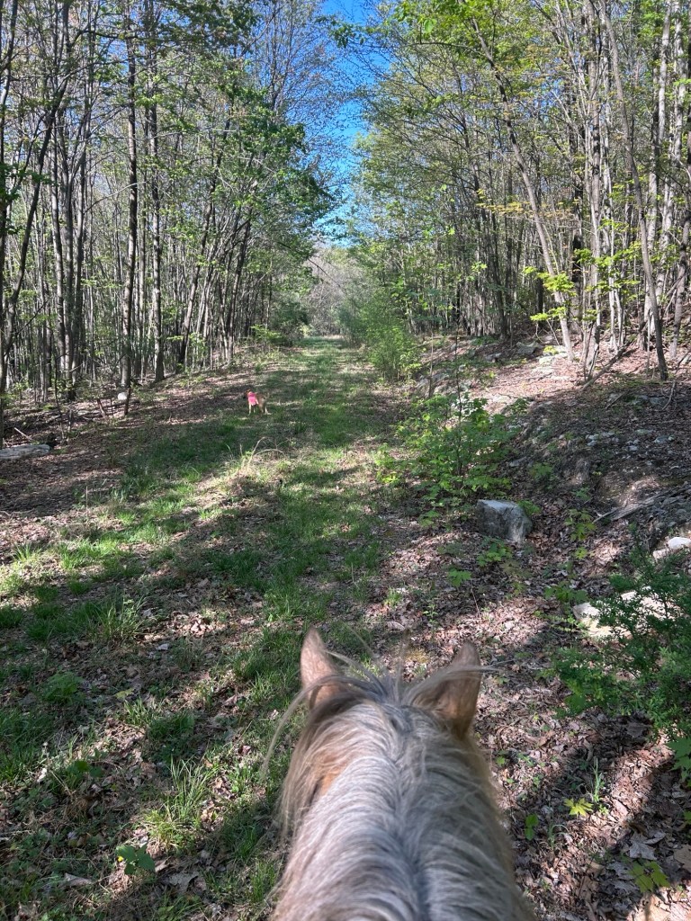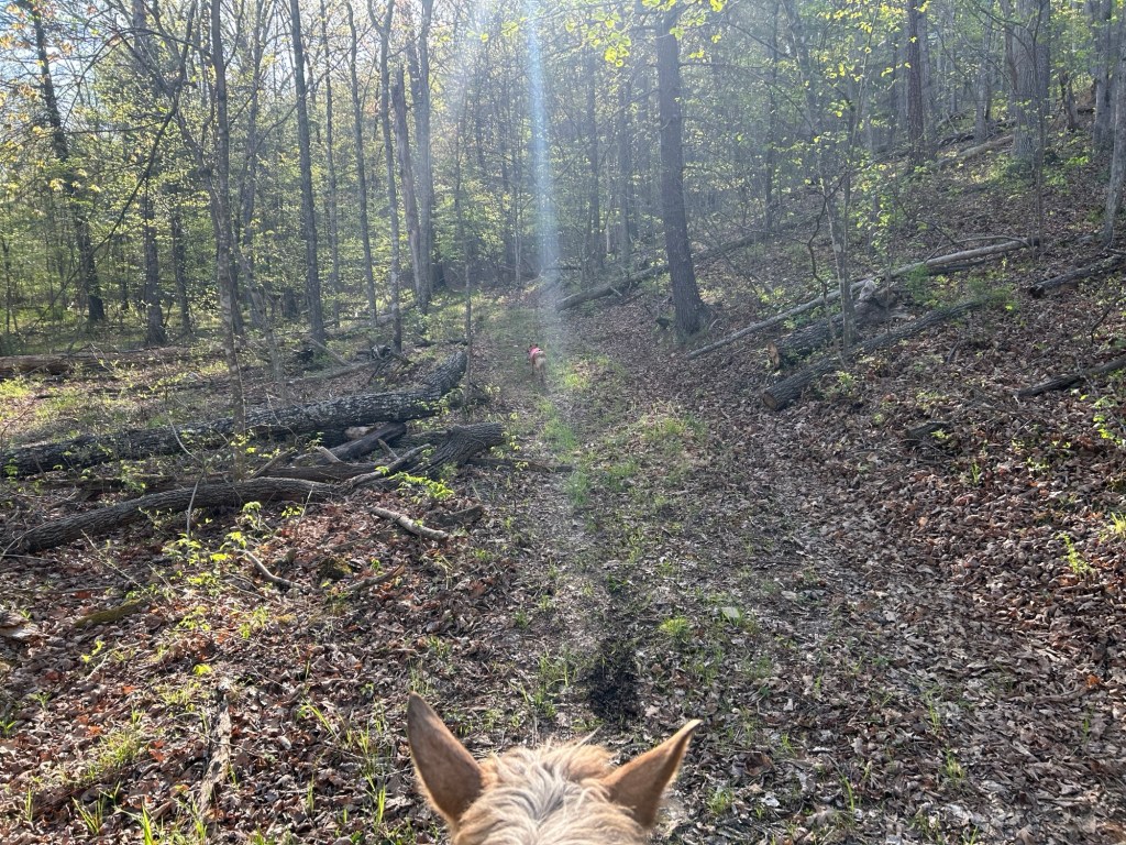 The trail went up hill for a short bit. There was a tree down on the trail. I sawed through the top branch with my hand saw. But then I was unable to move that section enough to get Simon over the bottom branch. And I was out of energy to saw another branch. This made me question how the other horse got through (why did it take me this long to think about that) and then I noticed a pushed down brush area a bit behind Simon. Obvi I took that route. The over growth on either side was pretty dense.