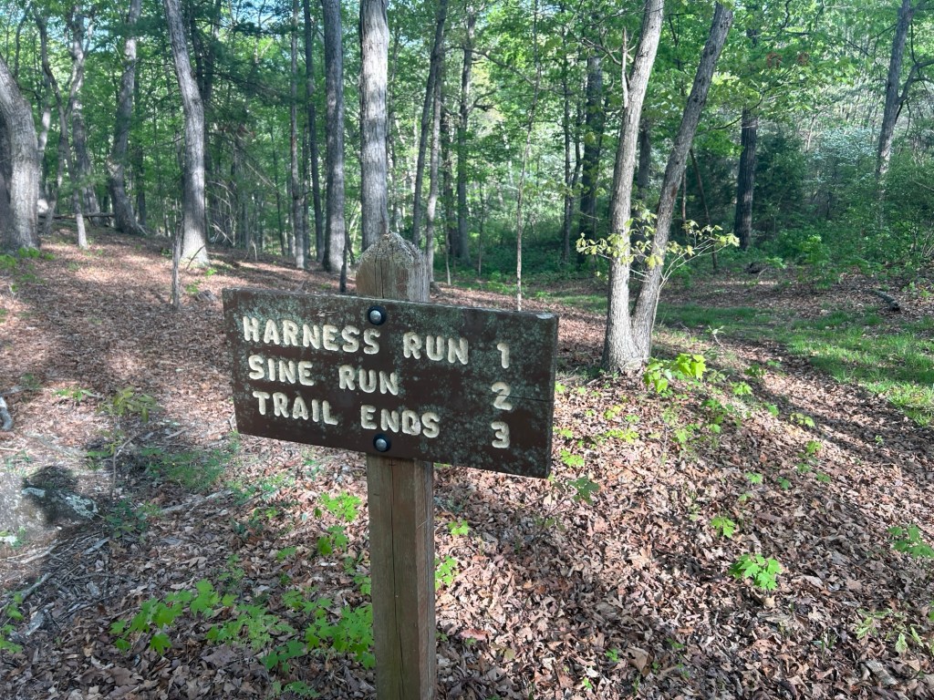 This trail ended at another T. There is a sign at the T, facing where I had come from. It appears to be telling me I am coming from Harness Trail. I need to reference the forest service map to have a better idea.