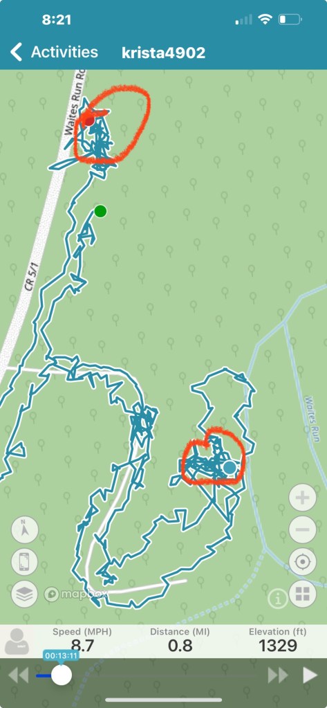 Back to Waites Run Road, I took a left and continued down the road. I explored some camping spots on the right along the creek. I also noted a possibly unmaintained trail on the left, angled back so it was slightly easier to see on the ride back in the other direction. It was loosely marked with an old post, no sign attached.