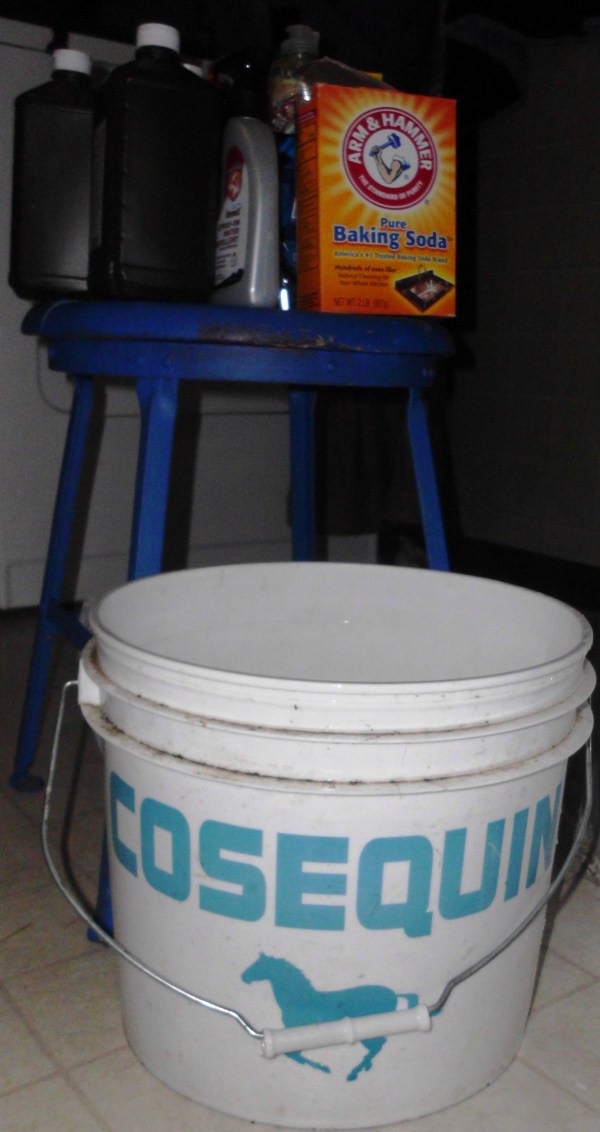 I went back to the store and restocked on ingredients. Then I placed the blanket back in the bathtub and filled it with a few inches of warm water. Then I filled a bucket half way with warm water and added in 3 large bottles of peroxide, a massive box of baking soda and a few very generous squirts of Dawn dish soap. I mixed it up and then poured it onto the blanket, scrubbed it around some and then left it sit for about a half hour.