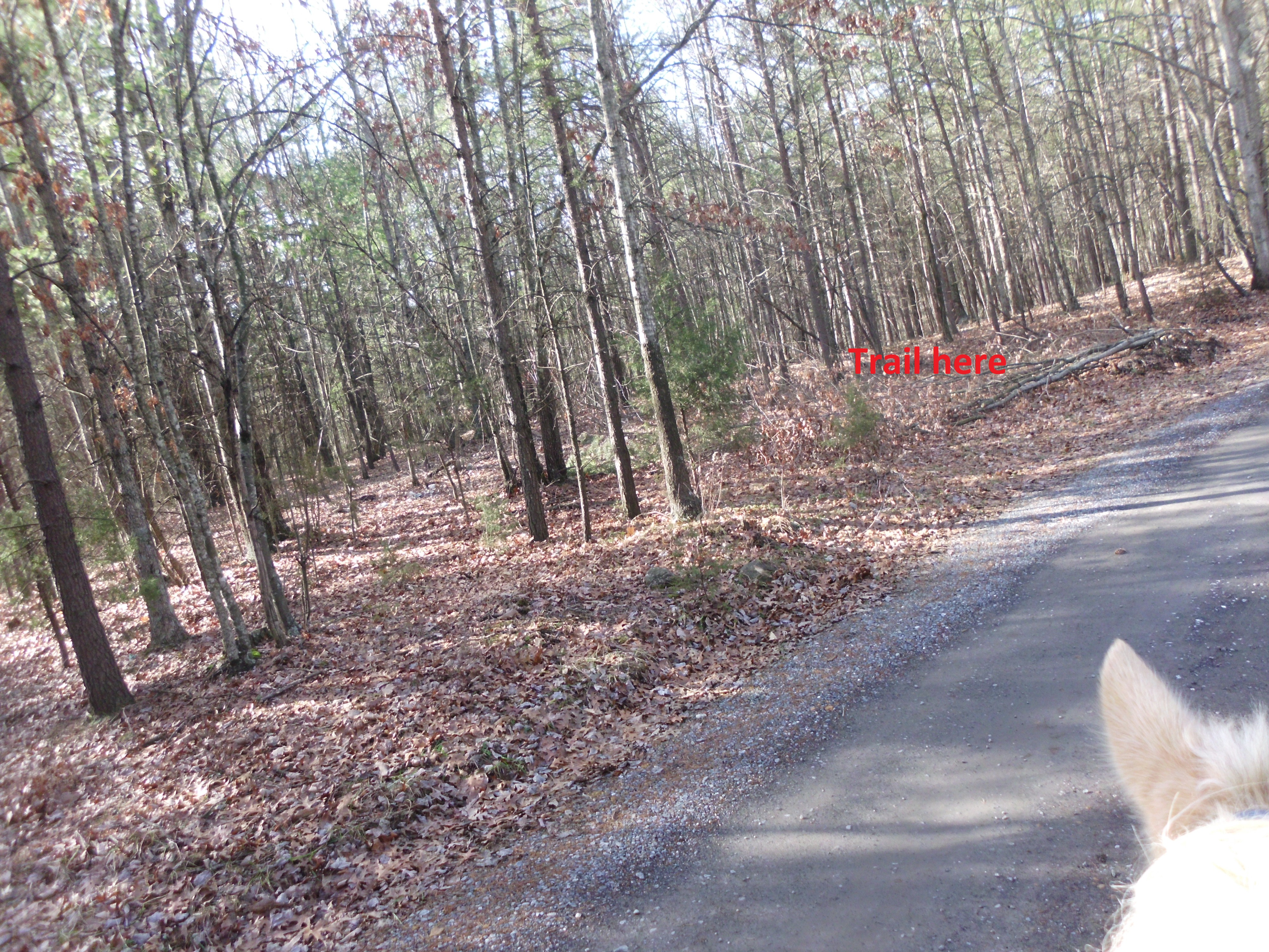 At about this point you may also notice another clearly cut path, running along the side of the hill but below the trail you are following. It is very clear and appears man made and used. but trickles out and appears to dead end a few yards steeply down from your path. I will have to investigate this mystery path on a future ride. It will probably require dismounting and sliding down the hill to it or trekking a longer distance through the woods to reach it with less of a decent.