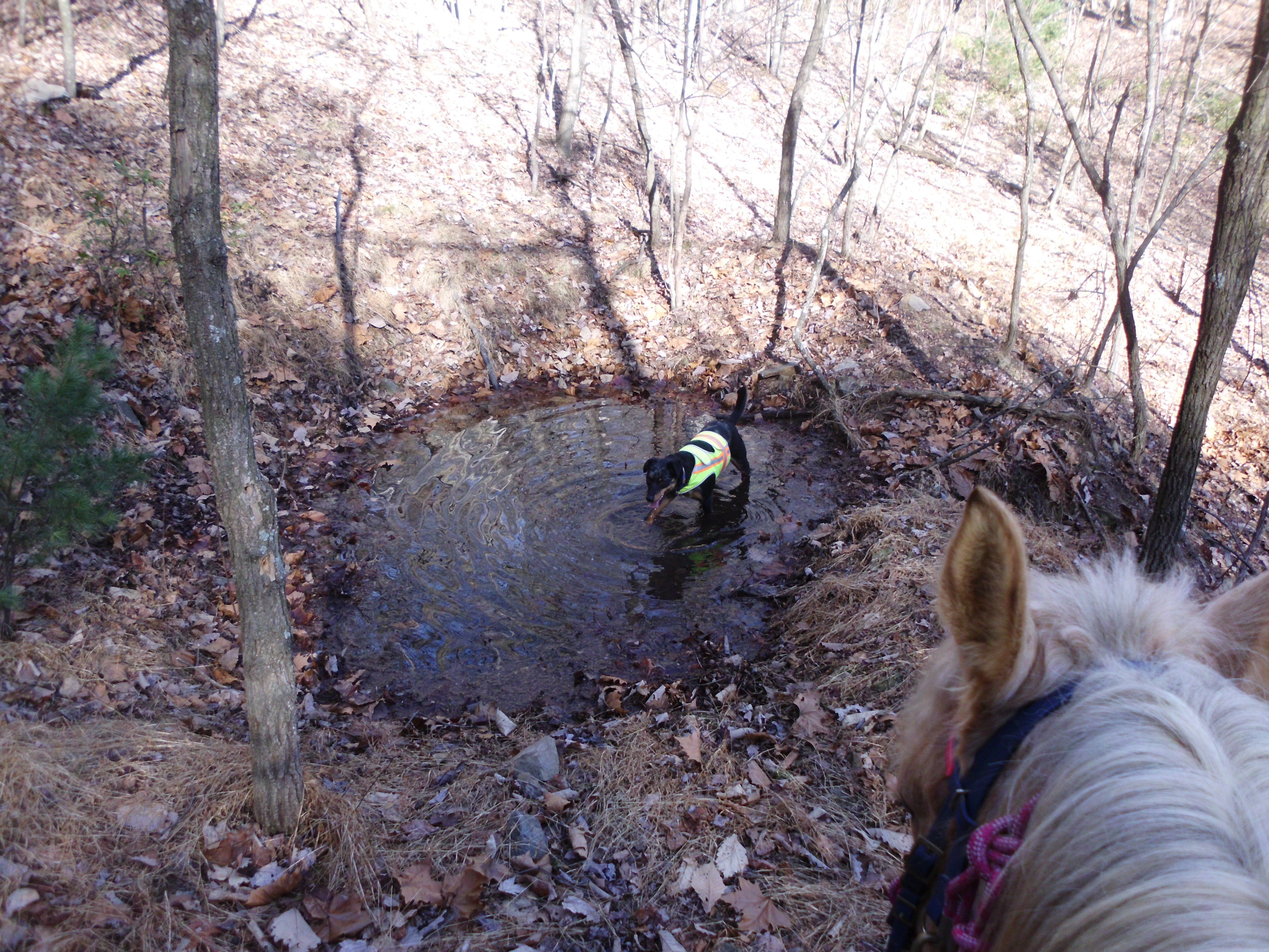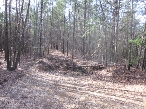 The branch appears to have three directions, left, right and straight. I continued straight and the trail wound along pleasantly. At one point you ride on sort of a ridge along the side of a hill, it appears to have been cut and then overgrown but with a nice worn path winding along it. This portion of the trail abruptly ends at a washed out area. There is a man made water hole (probably a gross stagnant mosquito breeding ground in warm weather) and the general area around it appears to be rocky and probably swampy flooded in the wet spring.