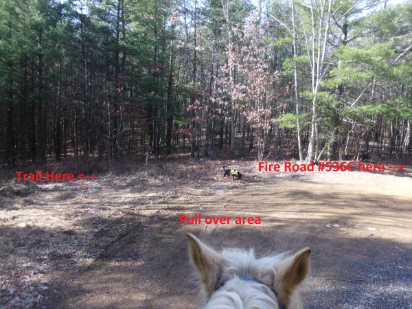 But to the right of this pull over are a couple berms, some large, that sort of face out in two directions. I *believe* this is the first fire road turn FR536C. I headed up it and followed well cut trails over and around the berms and followed a trail with a slight incline. It is the width of a fire road, but heavily over grown with small trees and bushes. The trail that cuts through them is well defined and clearly used. I saw boot and hoof prints on this trail, several clipped back and broken back branches at rider height, and it was clear enough to get in a bit of a trot and canter at some points. It wound around pleasantly for a good ways, with a slight incline and eventually reached a branching point.