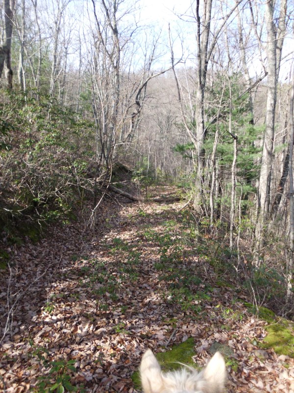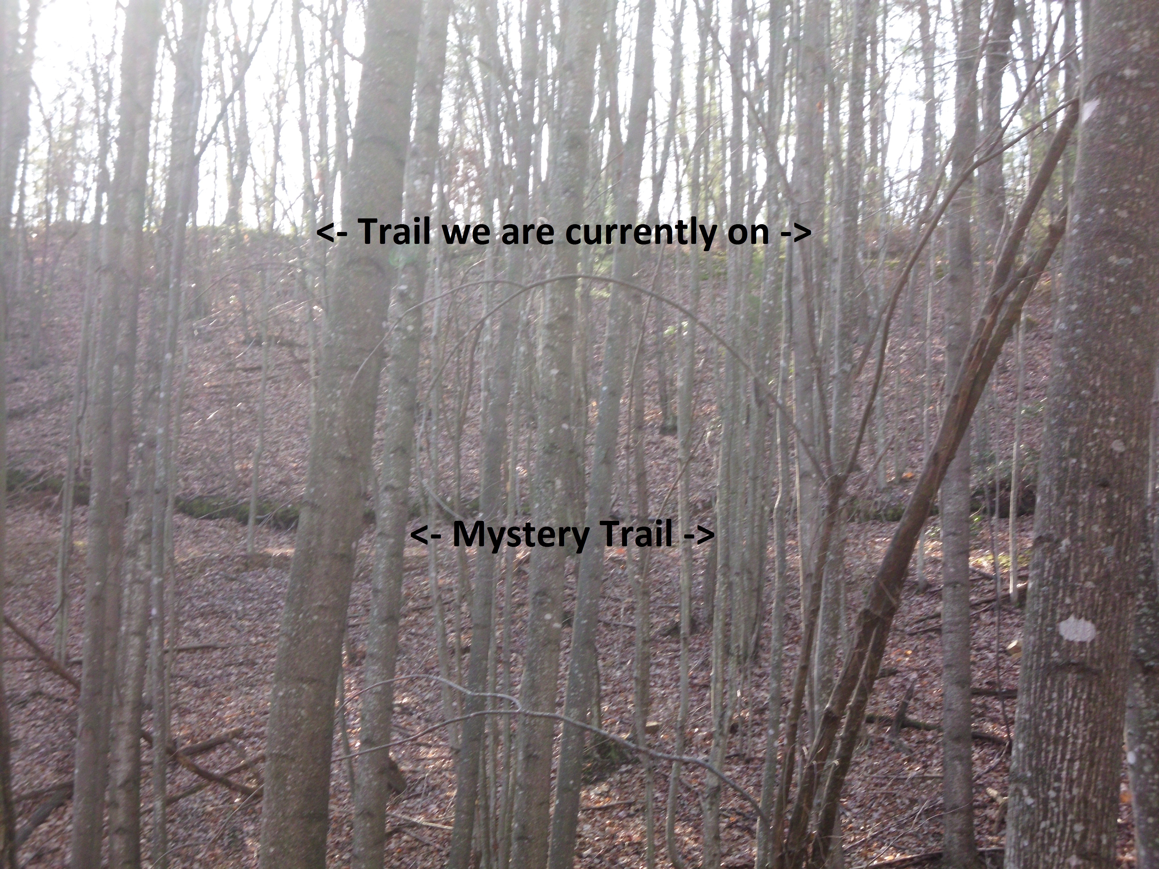 The trail you are currently on continues and eventually begins a steep climb into deep leaf litter, making a sharp turn right, and climbing. I stopped at this point, as the trail was hard to follow in the leaves and was very steep and I was not interesting in going back down it later. I will investigate in the future though.