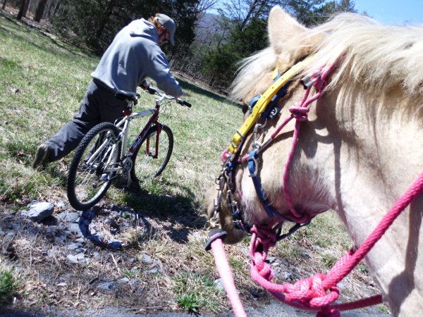 Simon has seen a lot of bikes. We pass bikers while riding on trails on occasion, and it has never phased him. But seeing my husband riding a bike was very interesting to him. Rich let Simon smell the bike and Simon lipped the seat and mouthed the rear tire. Then rich rolled it away, climbed on and took it for a circle. Simon snorted and watched very attentively.