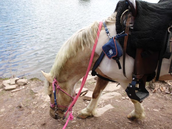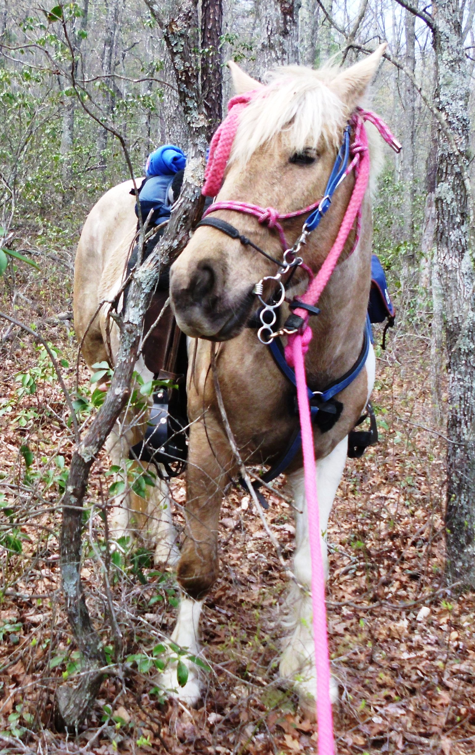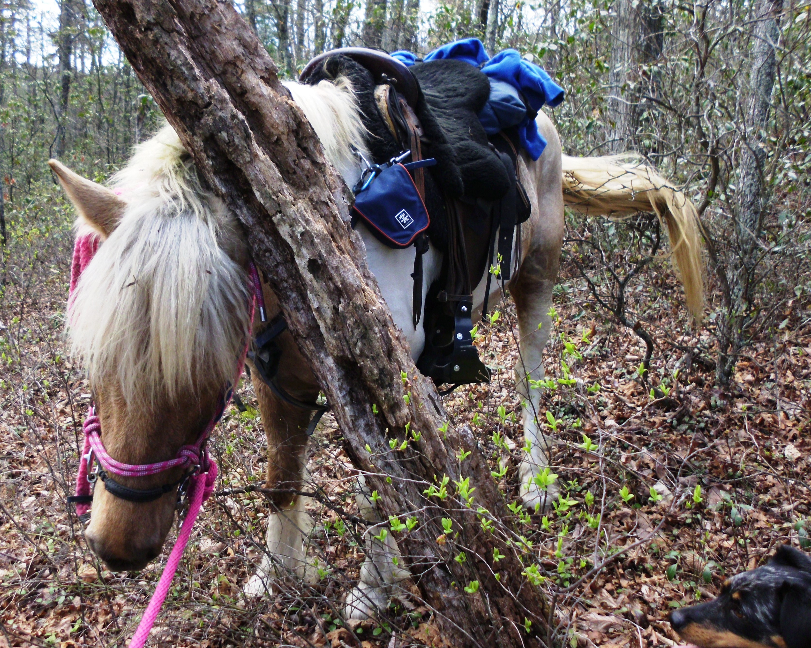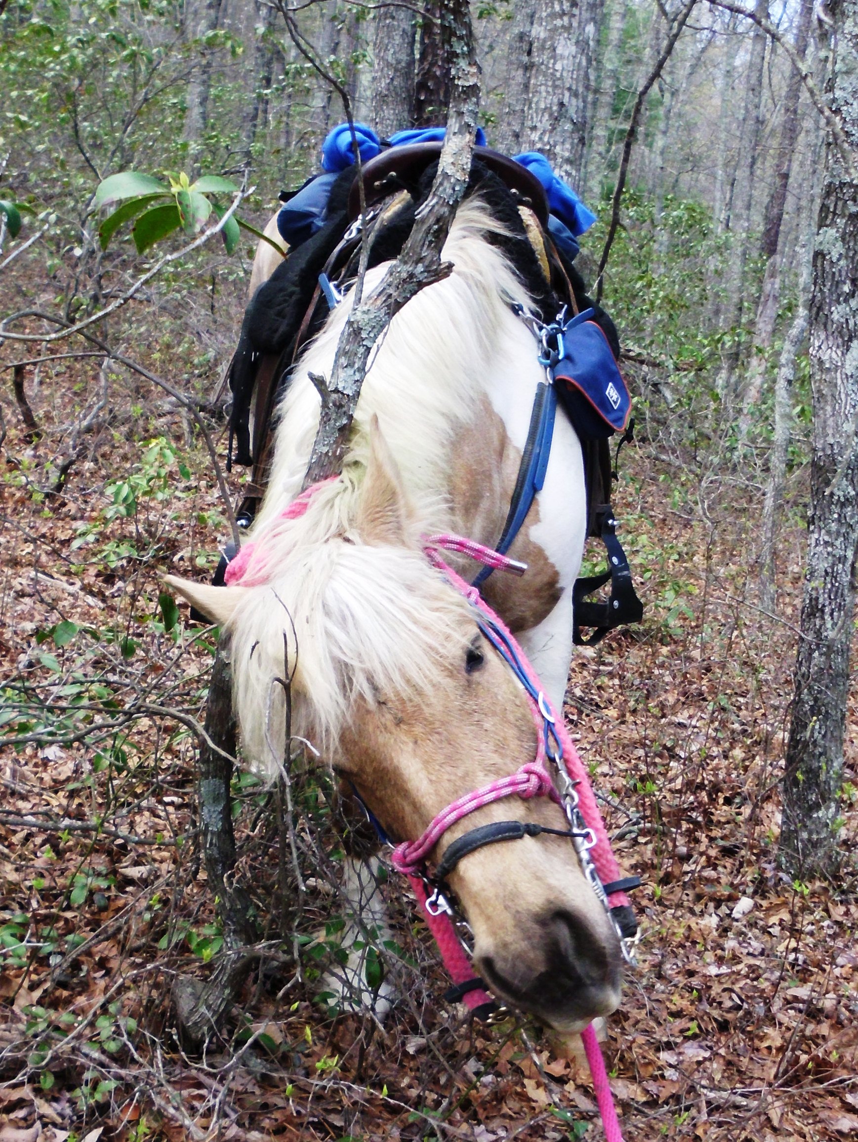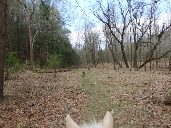 I made a few detours along the ride in the name of exploration.  The first deviation I made was to pop onto trail #434.  This is at the bottom of the fireroad close to the lake parking area.  it tromps back through a flood area (which the whole lake area is).  It was a neat little twisty trail through soft footing which ends shortly at a creek.  You can see across the creek where the trail continues.  I spotted one of the yellow blazed trees, but the creek is full of washed up fallen branches and trees.  It would be a little difficult to cross on foot, clambering over the wash, but it was certainly out of the question with a pony in tow.
