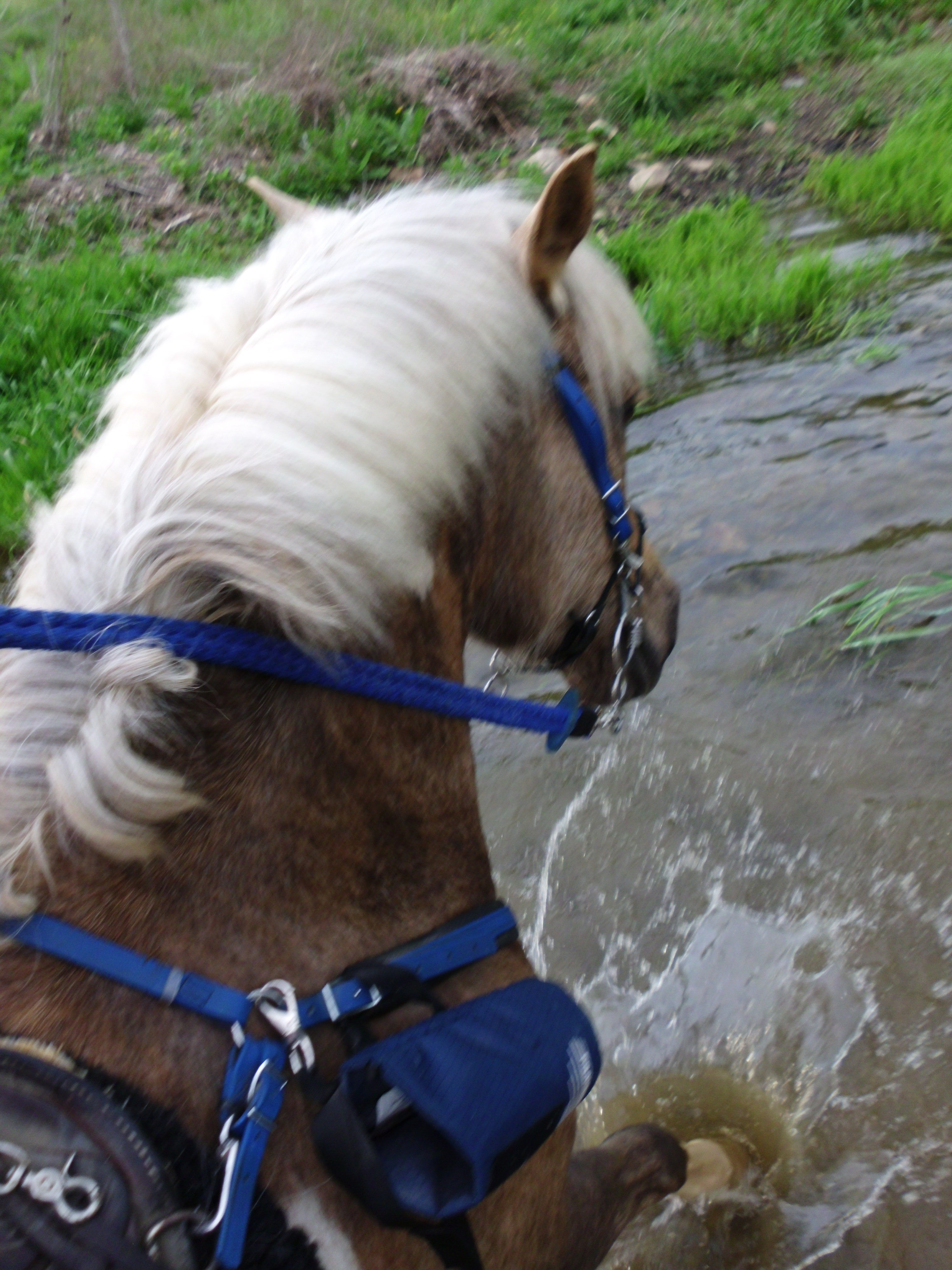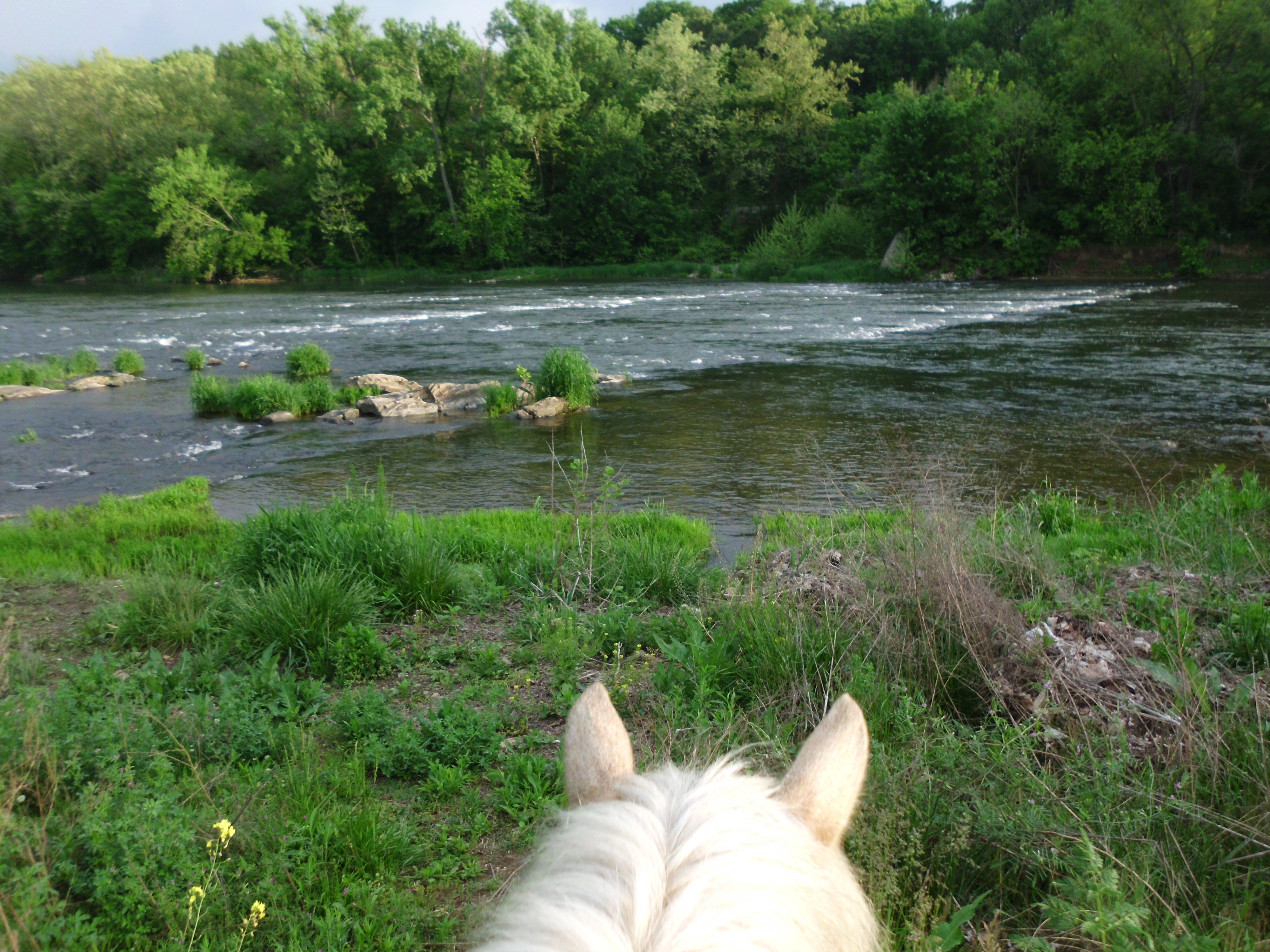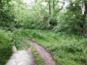 Simon and I headed down the short foot trail to the put-in spot, so we could see if anything had changed. It hadn’t. Along the path there is a foot bridge that crosses over water flow. It was too muddy for Simon to go through the creek bed, so I hopped off and we jogged over the bouncy bridge. Probably not the safest thing to do. I doubt it was designed with a pony in mind. But Simon is a sturdy thing and fully trusts me so without bulking we crossed it just fine. We also recrossed it successfully on our way back to the entrance.