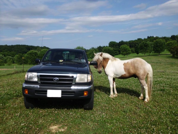 When we reached the top and needed to drive out of the field Simon stuck his head in the truck and tried to grab things out of the cab, including the seat covers. He stood in front of the truck, blocking it from moving and pushed the side mirrors with his head. He really did not want his new truck friend to leave. But eventually the promise of dinner over came his playfulness and he followed me to the barnyard shaking his head and nipping at my pockets to urge me along.