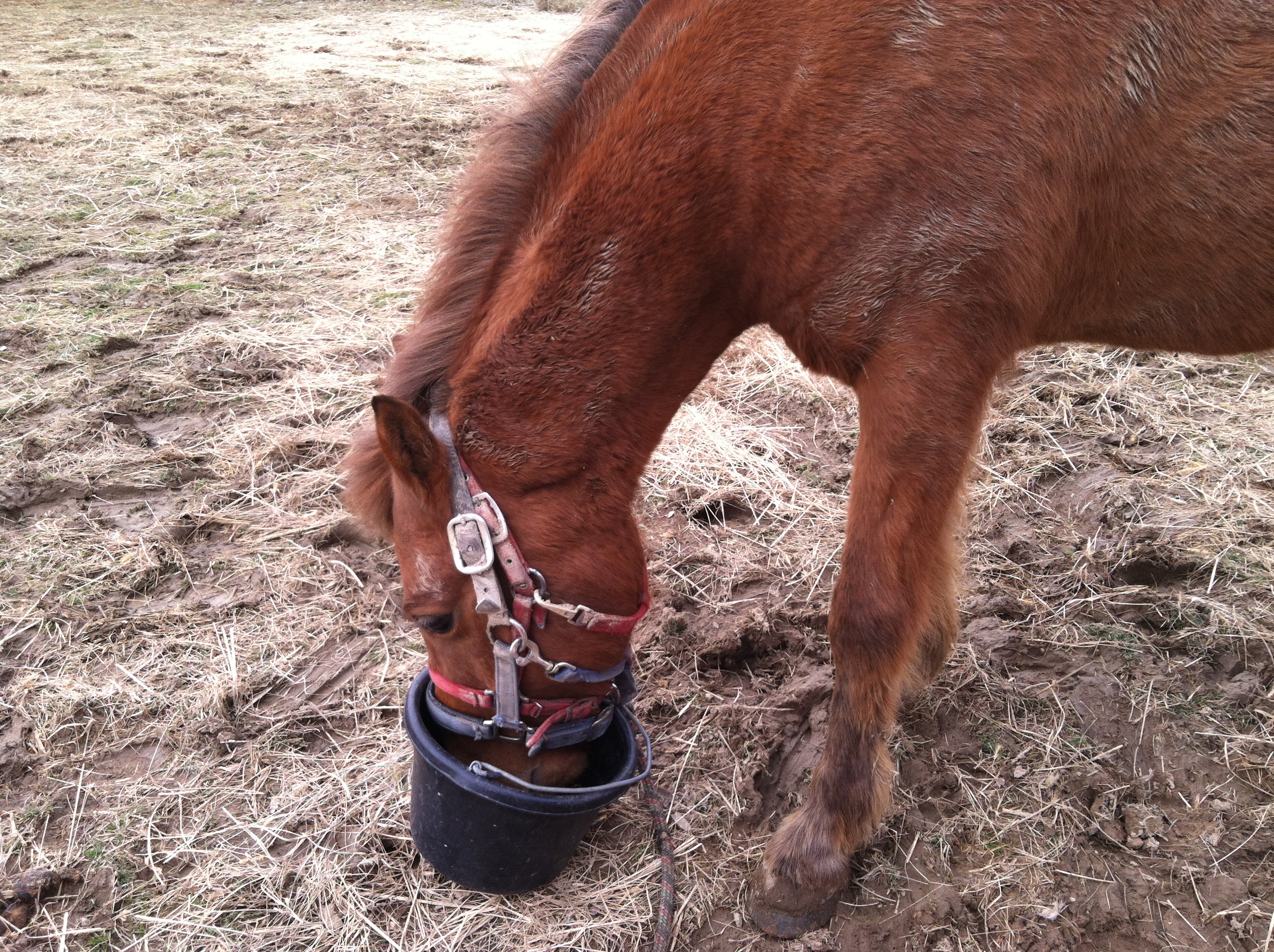 Yesterday Cooper showed a lot of improvement. He nickered at me when he saw me walk up to the fence. He nickered again when I brought his feed out and actually walked towards me. When I reached for the lead I have left attached to him, he turned and trotted away. But then stopped and let me walk up and take hold of his rope. What improvement!