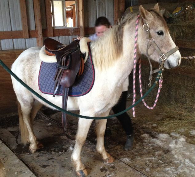 It started to rain lightly just before Lindsey arrived but we wanted to check out our new ponies under saddle together so we tacked up Cooper and Cisco, collectively checking the fit and making adjustments to our tack. Then we headed down to the riding field.