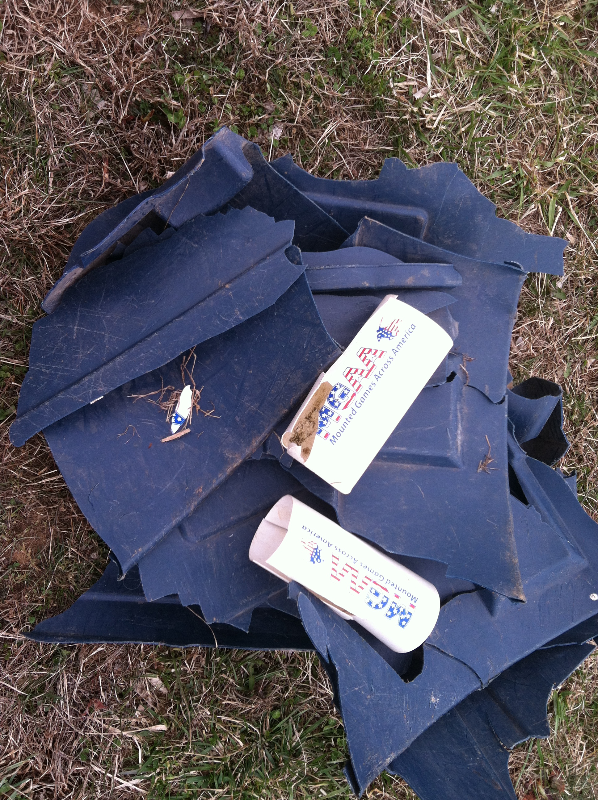 Simon spent some time destroying the “roundish pen” two times. I also found the games equipment pulverized, nice. Simon even ripped up a cone and the mounting block is covered in bite marks.