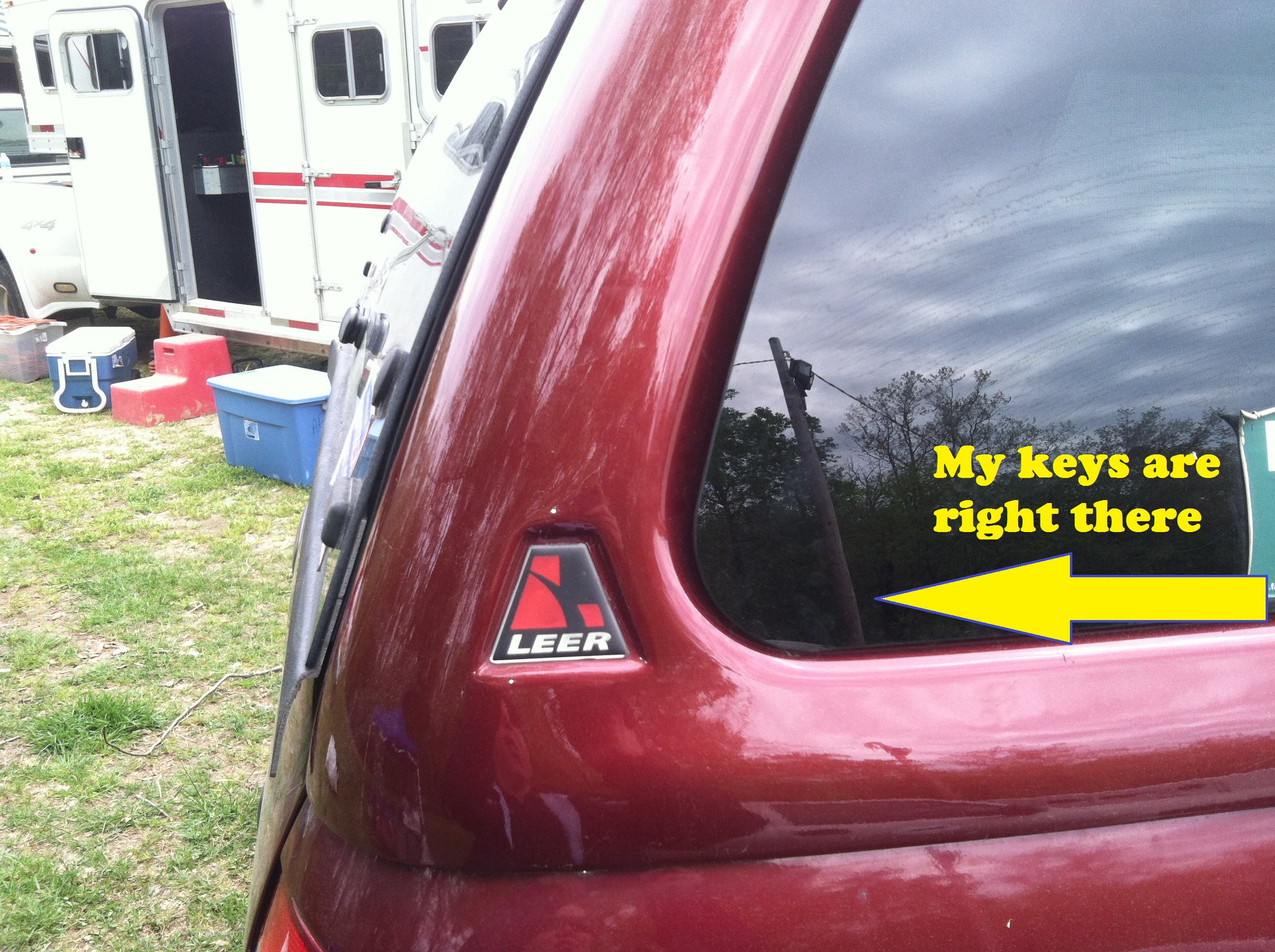 At the end of the MGAA Mid-Atlantic #1 competition weekend full of ponies, friends and fun, it was time to pack up camp and hook the trailers back up. I got all of Simon’s stuff packed into the trailer and all of my stuff packed in my truck and then accidentally locked my keys into the cap of the truck. whoops. I do not normally lock the cap at competitions but I must have hit the locking mechanism when I was packing or something and it locked when I closed it.