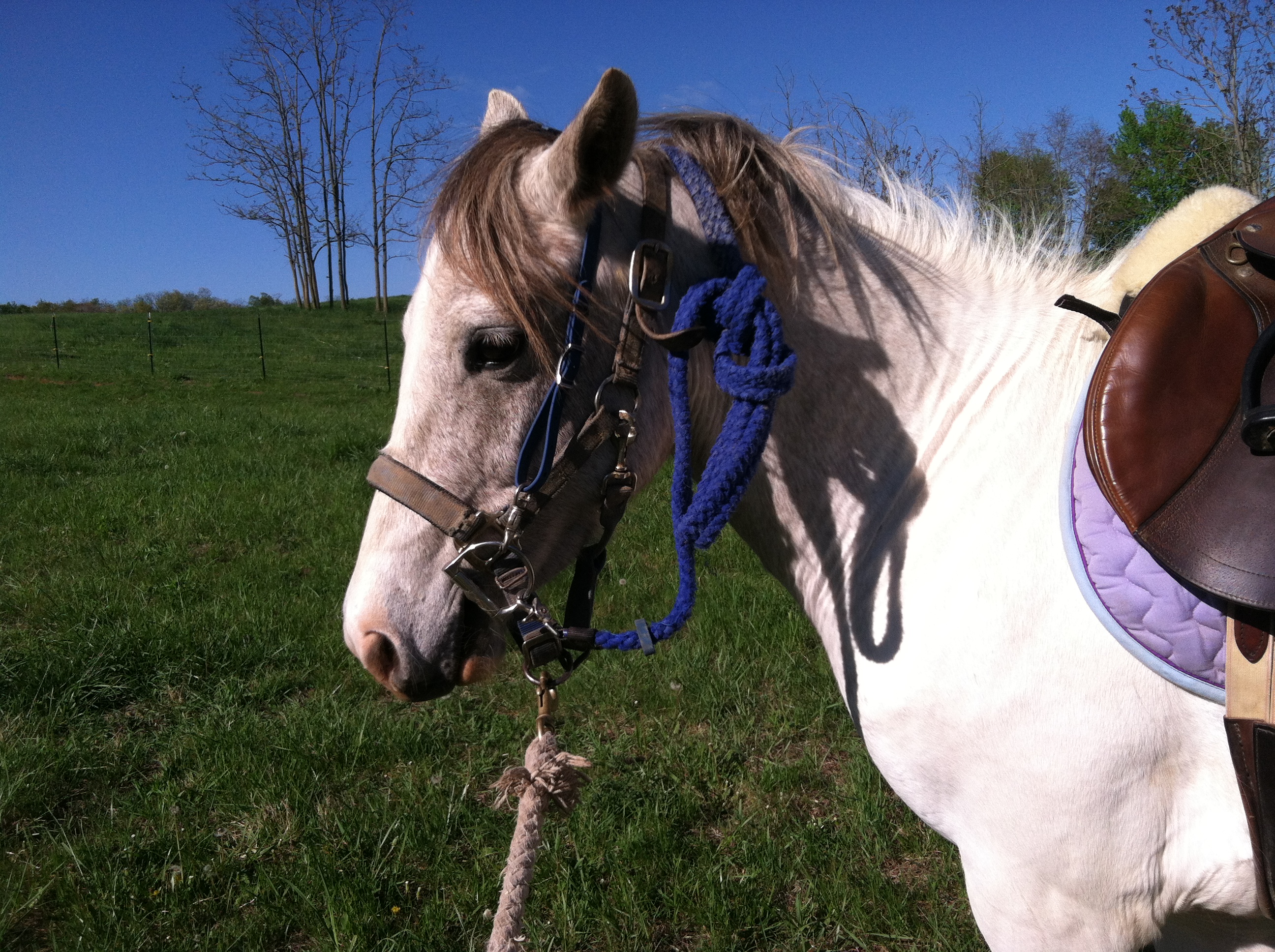 I started each day by tying him up and giving him a good grooming, hoof picking, etc. He is already good at being tied and groomed, but I wanted to reinforce this and start off on a good note with each session. Next I tacked him up, which he is also comfortable with. Even if I am not going to mount up, I feel that tacking up makes it clear that this is work time. I took him to a different area of the field each day and lunged him.