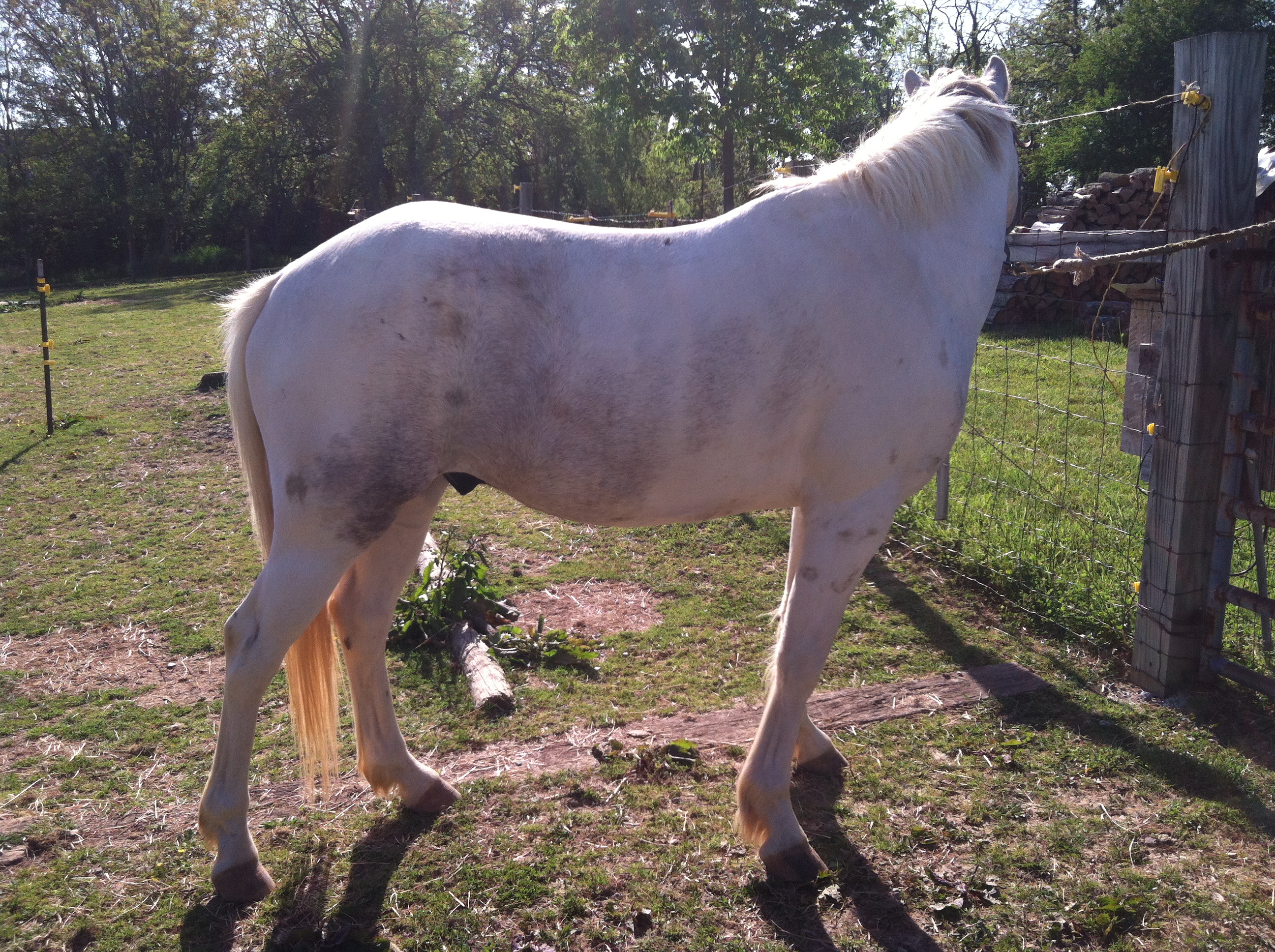 Several people have asked me what color Linus is. And honestly, I am not completely sure. When I got him he had a winter coat, which tends to be a little different than a summer coat, and often lighter in color. He clearly has some roaning, but it was not clear to what degree. up close it appears to be red roaning, but from afar it sort of looks like blue roaning. he also had some blue in the to pof his mane, which might have been throwing me off. To complicate things, he often has grass, mud or poo marks on him, making it harder to determine what color his marks are, and also, what is an actual natural mark and what is a stain. Complicated.