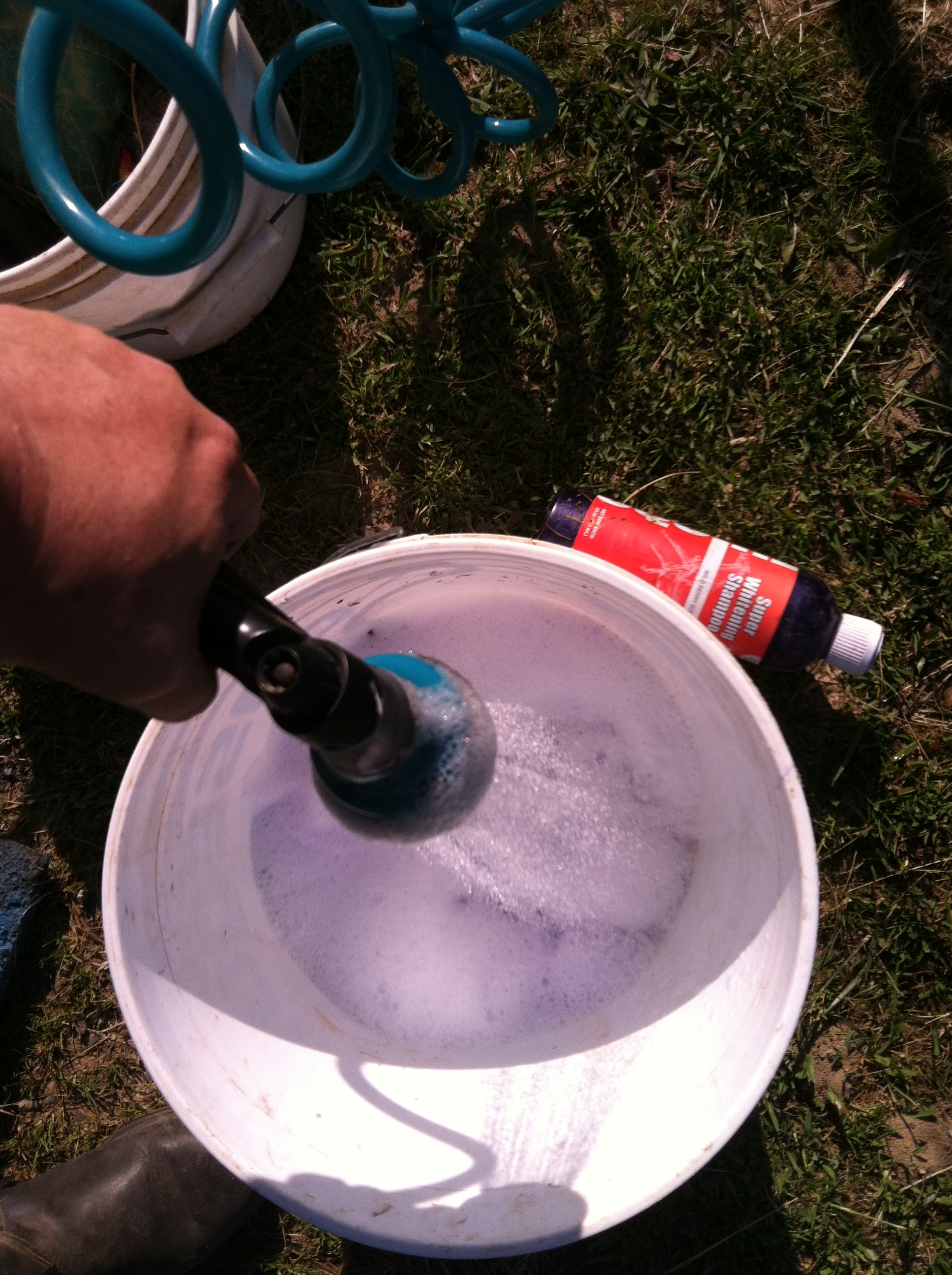 Mind you this was Linus’s first bath. He did very well. he was a little unsure of the hose, but he actually liked the water hitting him, and quickly stuck his head into the spray. After a few minutes, chewing and licking his lips and deciding that the hose was not going to kill him, he stood happily, ground tied, while I worked away scrubbing and cleaning him up.
