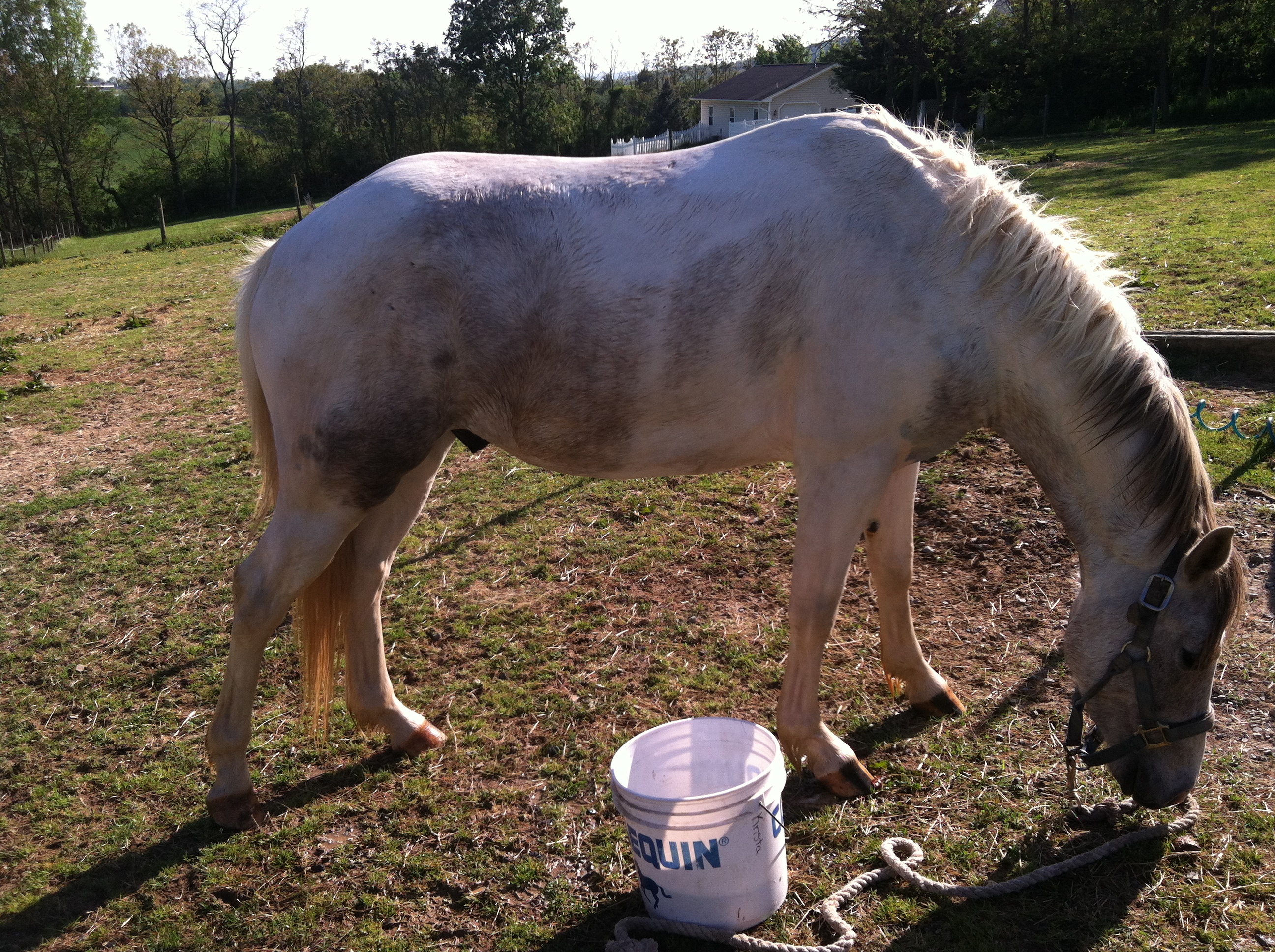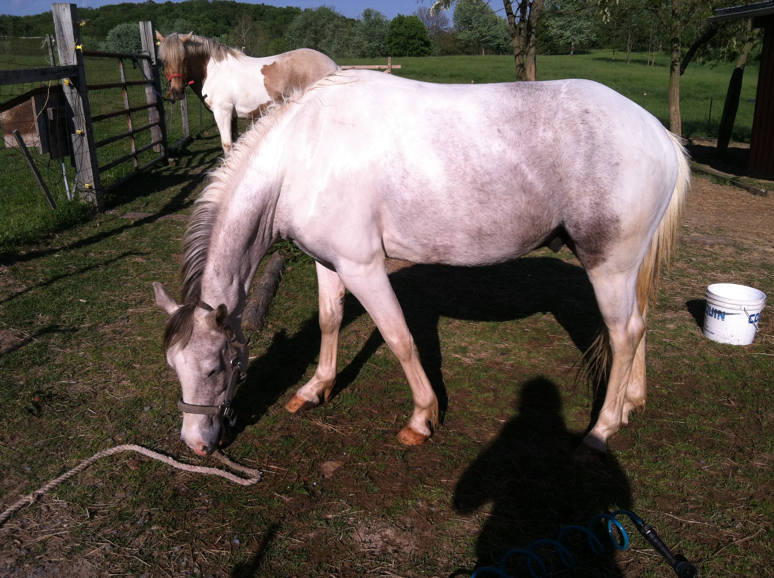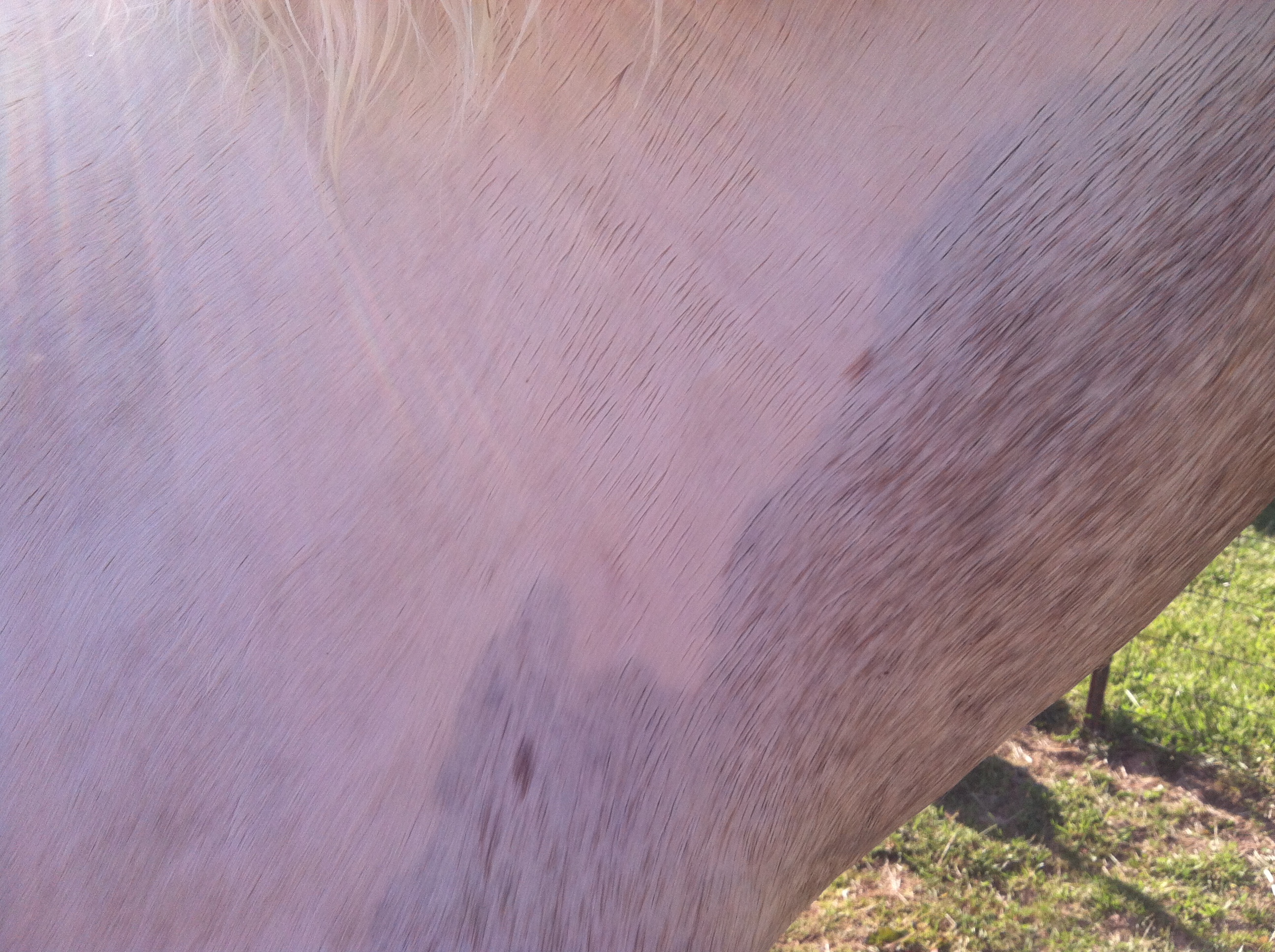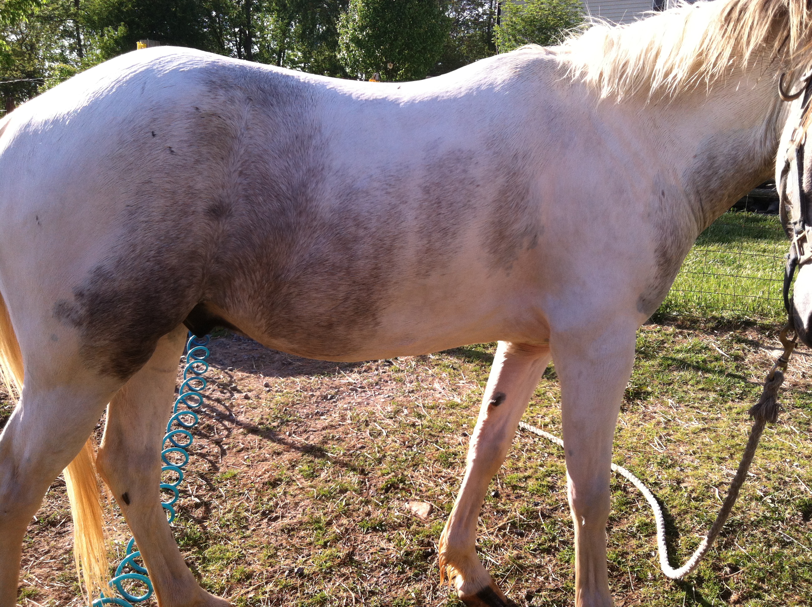 The roan patch under his neck is easy to see. Its wet and freshly washed here and the skin shows through nicely.