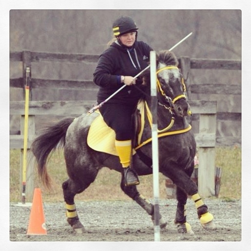 There were four other riders in my division.  Sarah rides on the team, Red Solo Cup, and was on her new pony, Chip, who is brand new to games. He did fantastic and I think Sarah was happy with his performance.  Anne rides on the team, Time  Flies, and she was on her Morgan. Although he has been with Anne for 15 years, he is new to games. He also performed exceptionally well and seemed to take to games.  Laura rode her TB mare, Annie, who is an unusual tall mounted games pony.  For a TB she really seems to take to it with level headed enthusiasm.  Mackenzie was on another larger mount, who was lovingly referred to as, “the fox hunting rhinoceros”.  A lovely looking mare that’s new to the sport.  Poe and I completed our division of five.