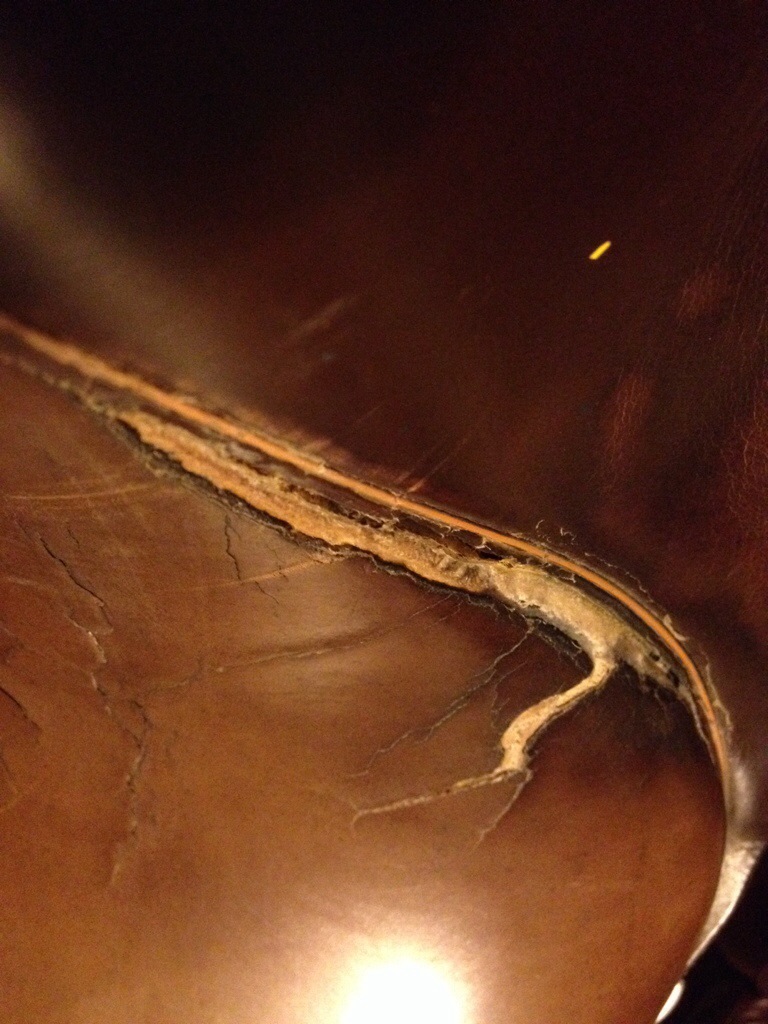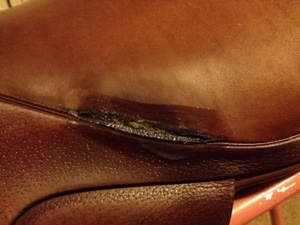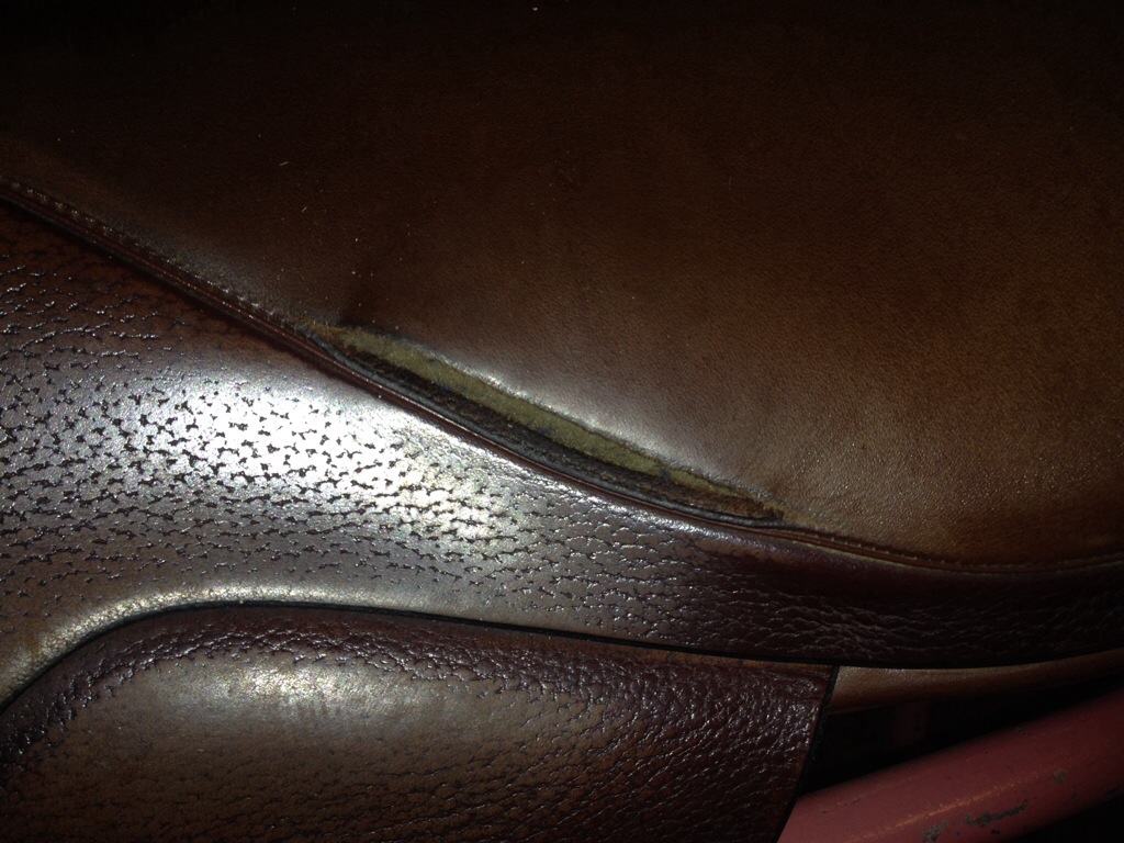 A little tid-bit I learned in this experience is that these rips are caused by riding in jeans.  The inner seam of the jeans rubs and puts pressure on this delicate part of the seat which eventually breaks down the leather and leads to a split.  I personally can’t stand riding in jeans.  That same seam rubs the delicate skin on my leg, just like the saddle.  But all of my saddles have come to me used, so apparently some of their previous owners did ride in jeans.