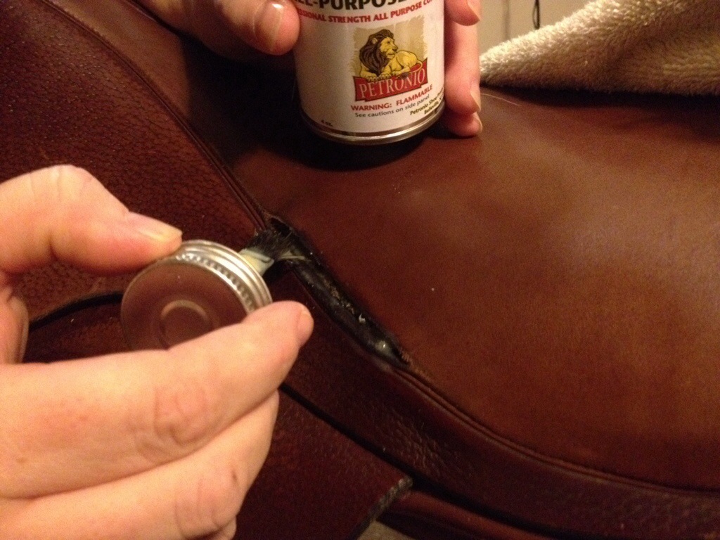 Last night, I jumped in with both feet and got busy.  I cut a piece of the leather to patch the Ainsley.  I cut is quite a bit wider and longer, so it would more than fully cover the rip.  I cleaned the area, applied a little of the glue into the rip, and allowed it to harden, and then pressed it closed.  Then I applied glue to the saddle’s ripped area, and the back of the leather patch.  I allowed them to harden some, and then delicately applied the patch and then pressed it tightly.