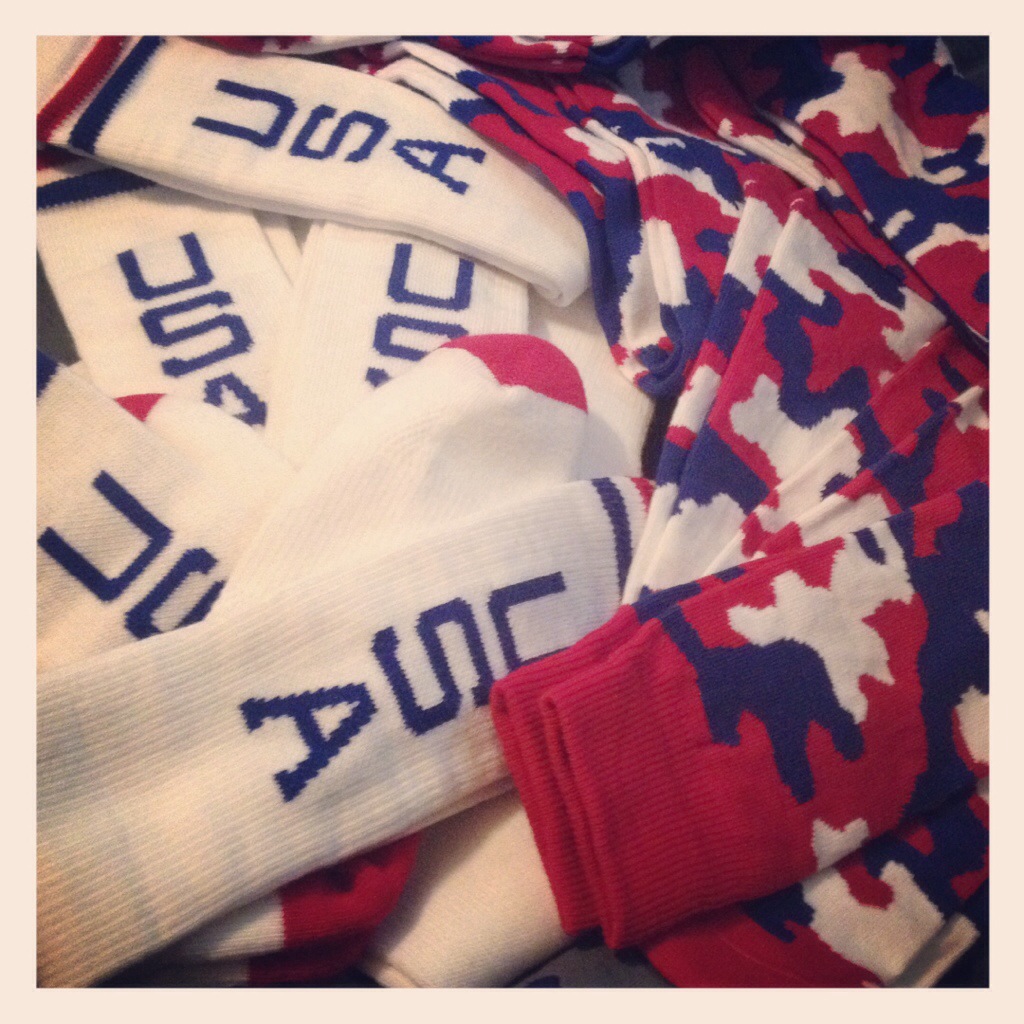 In USA mounted games, socks are a key team garment. They usually come up to the bottom of the riders knees and can be as wild as the team chooses. Some riders miss match their socks, wearing different prints on each leg. Some teams like a conservative solid color.