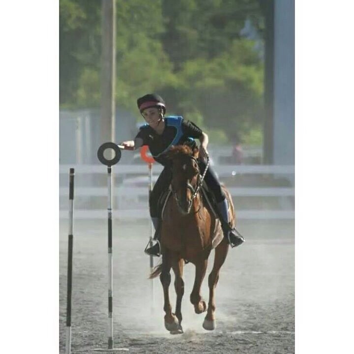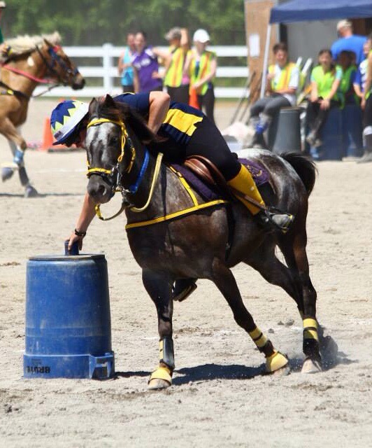 You might have picked up on a trend at this competition, the one where I suck in my first race. And if so, you would be accurate! I pulled it back together after that, running nicely through 4 flag (5th), Sword (5th), and Carton (1st). I was particularly happy with my carton because I leaned much farther than I usually do, and really got my hand down there. Genevieve got a photo of it, which was nice because I could prove to myself that I did not just imagine it! My litter was a crappy. When I got down there the litter had been knocked sideways, but that is not what messed me up. I just sucked. I did decent after that until Quoits race, which I totally bombed. I was so proud of my improved mounting, and pushed my team to let me ride Quoits race. I got down there, and when I went to get back on, Poe moved just a little, and my saddle slid just a little, and it took me a bit to get back on. This left me off center, and I missed my ring placement. I was just flat out sloppy with it. AHHH. So I had to get off, again, and then I really could not get back on. Poe was not being bad, he just took the smallest step, and my saddle was already slid over a bit, and it was not holding tight (my girth needed to go up a hole), so I ran back to the A line and Averi held Poe while I laboriously climbed back on. Averi gave me a smile and a reassuring word, which really helped, and I distinctly remember Carol Ann telling me my decision to run back was smart, and to shake it off. Both of these did help some, but I was just off my mental game. I bombed the race. Totally and completely, killed it. And what shreds of my confidence were left went out the window with all the possible points we did not get in that race.