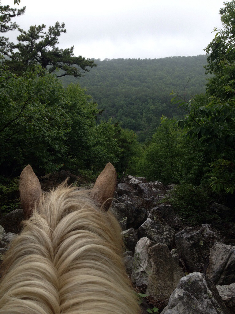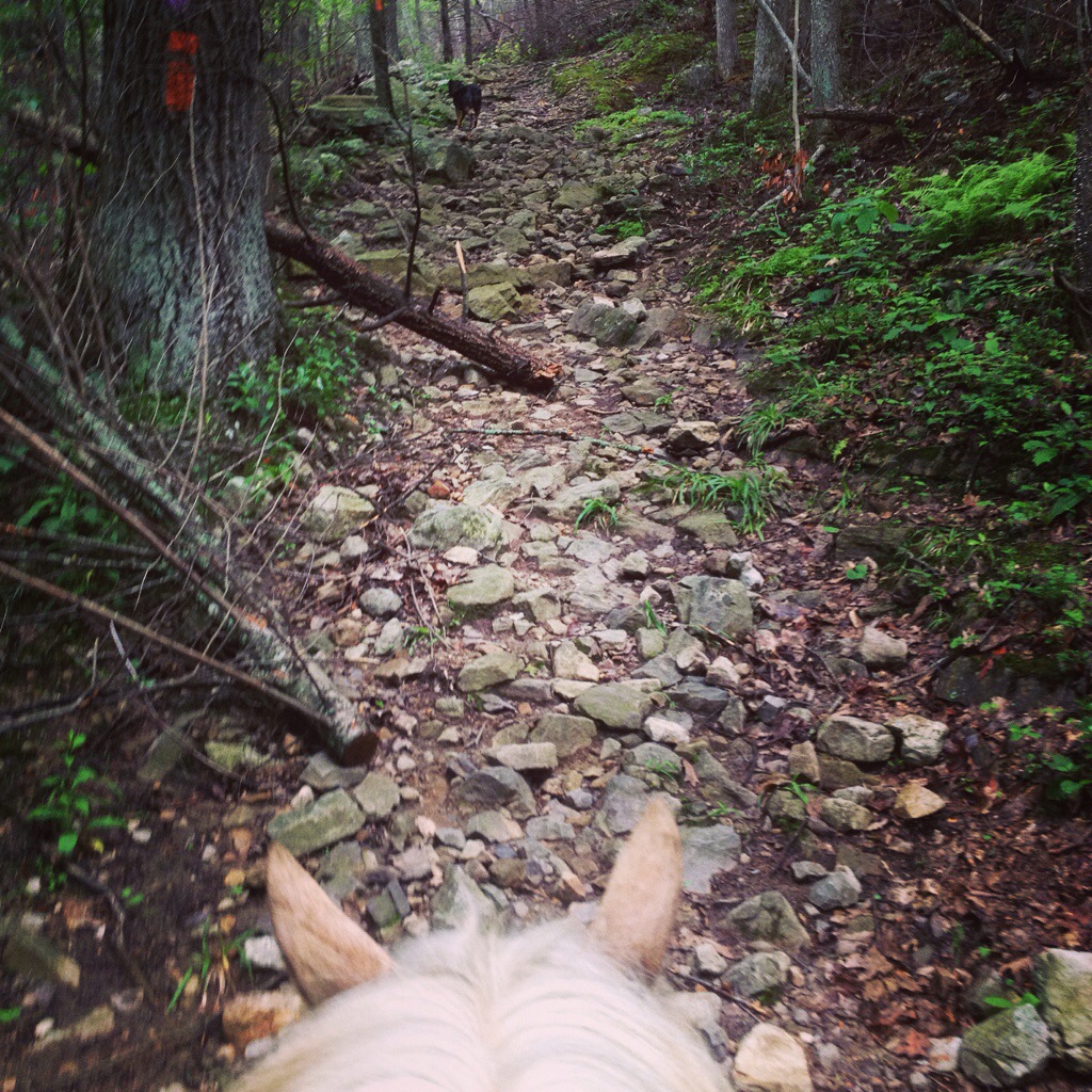 When the trail widened back up, I climbed back on and we proceeded. Simon refused to trot, no matter how soft and smooth the trail was. We soon reached a very rock part of the trail. It comically looked like someone had swept all the rocks from the surrounding forest onto the trail as a sort of giant gravel. Simon slowly continued on. He was walking terribly slow, so I hopped off to lead him. This only seemed to ignite a more dramatic reaction from him, as he slowed to taking one baby step, one hoof at a time and looking at me with pony-needs-a-treat-eyes. Ironically, he was taking firm smooth steps with the bare hoof, and was just as dramatic with the other three, solidly shod hooves. So I climbed back on and he did pick up the pace some, although never going faster than an ambling walk.