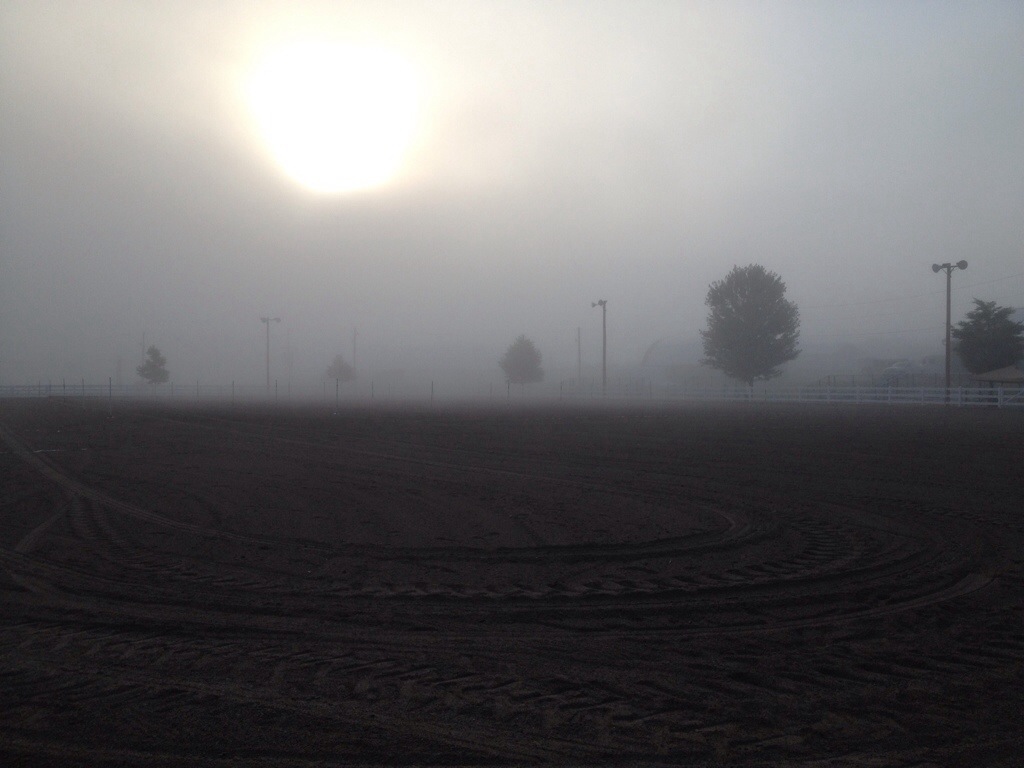 The first session was scheduled to start at 730a Friday morning. I was standing at the gate to the arena at 7am returning texts and answering emails and the fog dropped down onto the field. Luckily it burned back off just in time for our start. If you look closely you can see some bending poles out there.