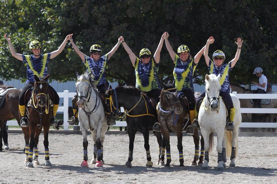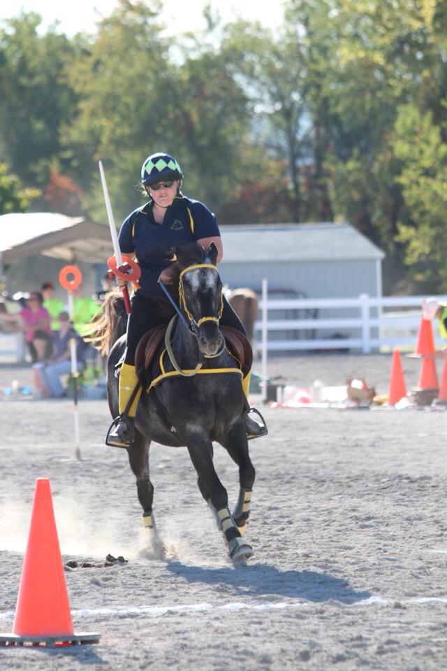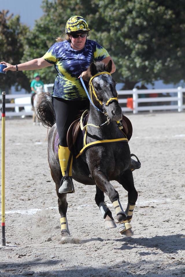 Sunday we rolled into the final 15 races, feeling good. I did pull myself from quite a few races that I have not been performing my best in, keeping the team’s needs in mind. Poe and I continued to start a lot of the races, and I felt like my trust in Poe’s checks was slightly better than the previous day. I had a close call on my sword ring pick up, but got lucky and it went clean. Ball and Cone was our nemesis and I completely killed the race. Poe would not stand when I leaned over, and would get too close to the cone. I finally managed to get it on but it rolled right on off. Lame. I hopped off and fixed it but then I could not get myself back on. Poe would not stand and I was quickly beginning to panic. Linda, who was just behind the A line behind me, reminded me what a good teammate she is. She called me to her side, and held Poe while I mounted up. It was quick thinking and a smart move on her part. She talked me off the panic wall while I climbed on, and I could feel my confidence steadying. It was one of those times, when riding with people that KNOW you, really pays off. I remounted, and finished the race, although I caused us to finishing second to last.