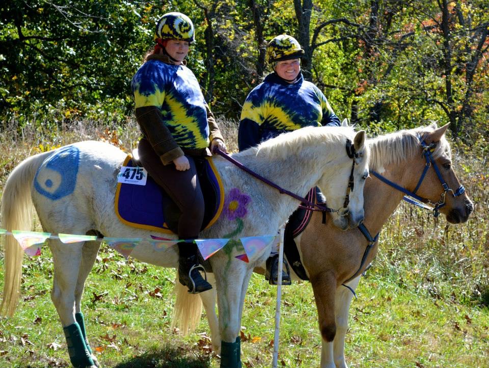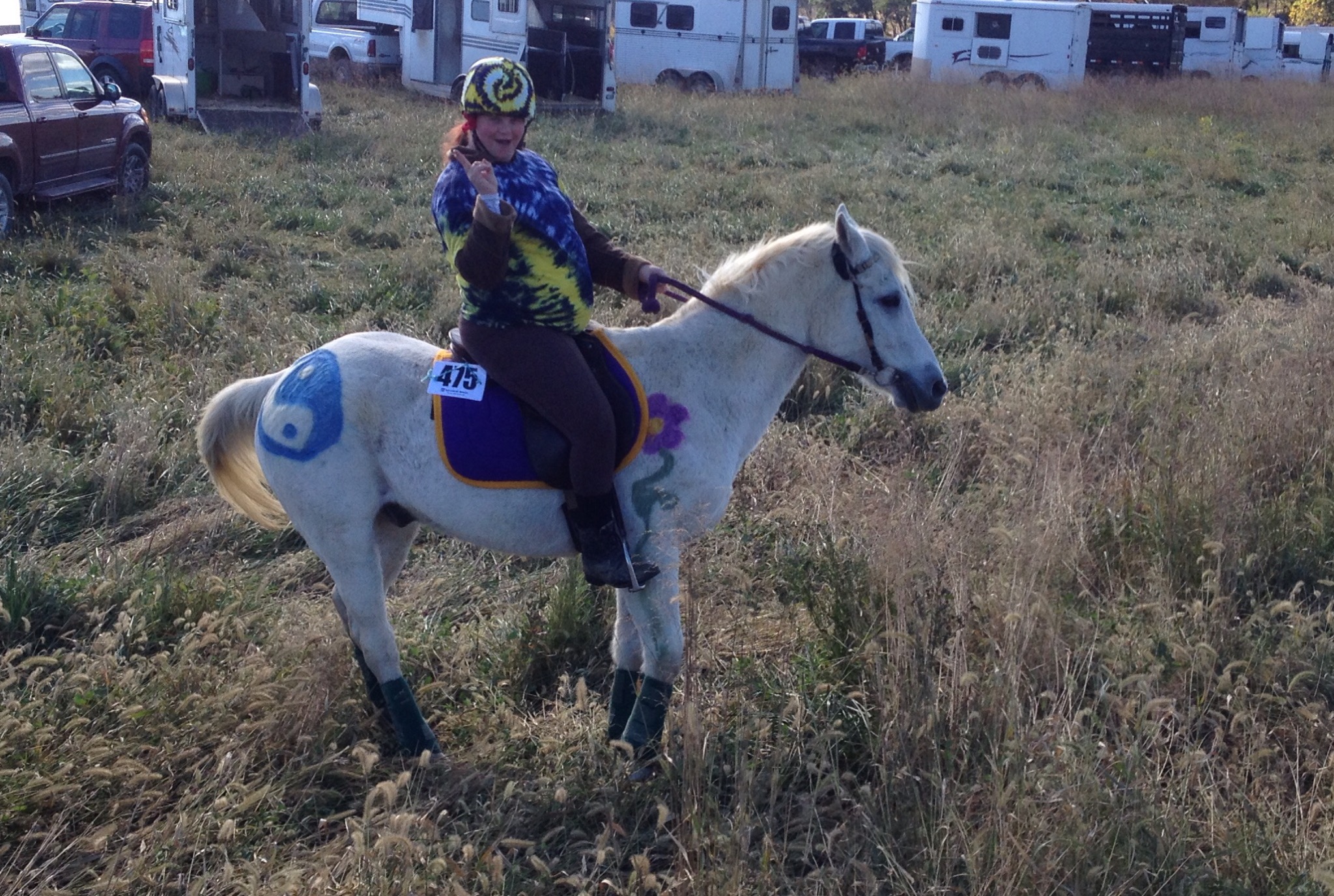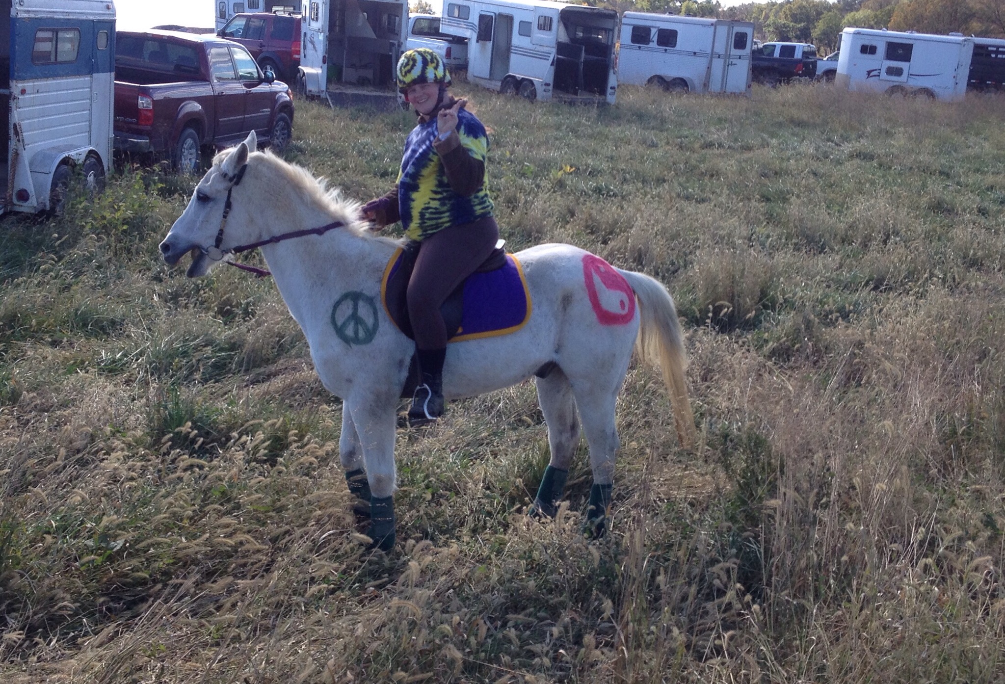 Val and Zoe met up with me, and we rode out together after getting our 70’s on. Half of the points for the final obstacle were decided on if rider and horse had on three visible 70’s items. We planned ahead and borrowed a set of tie dyed matching t-shirts and helmet covers from the Old School team gear, and Val brought paint which she and Zoe applied to our ponies in the form of flowers and ying yangs. We looked good. Other riders had on giant wigs, flowers, big sunglasses, and peace signs, not to mention tassels and fringe!!