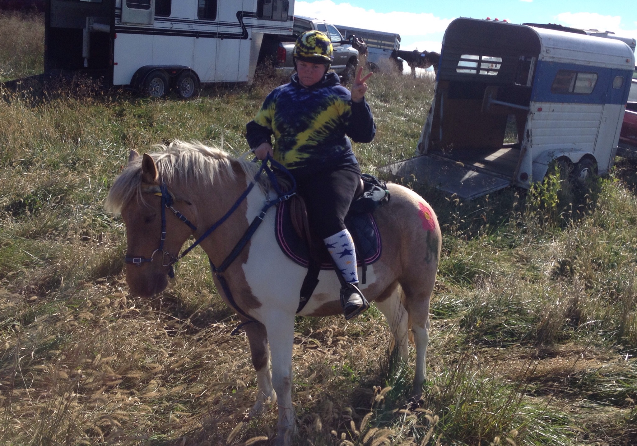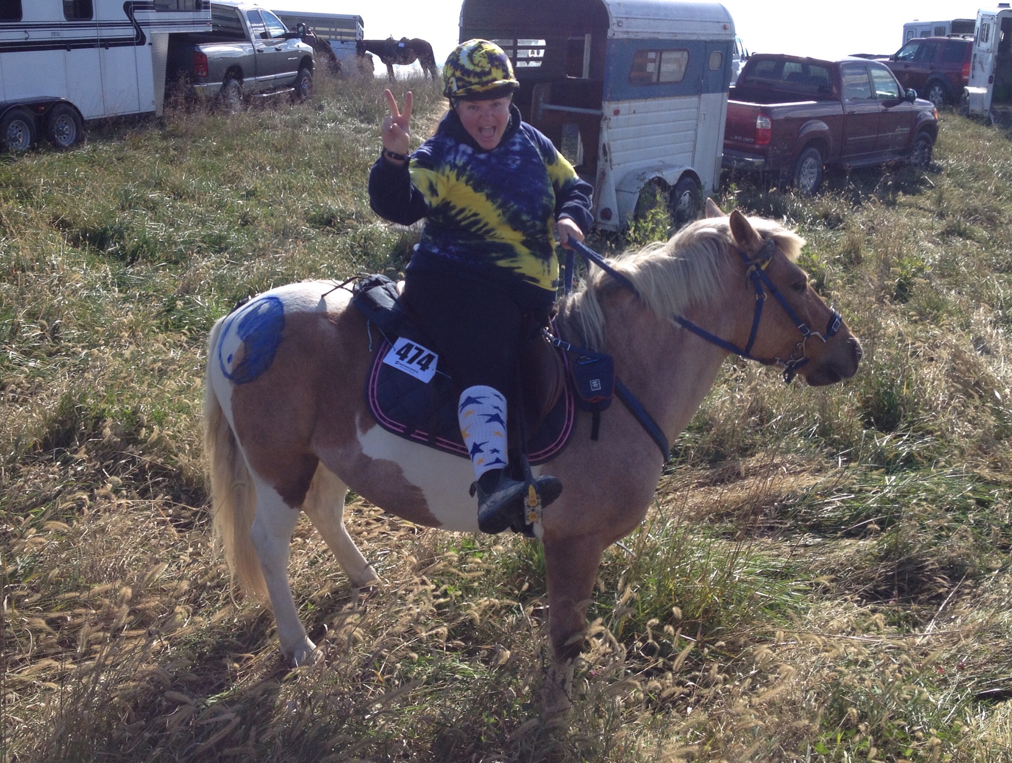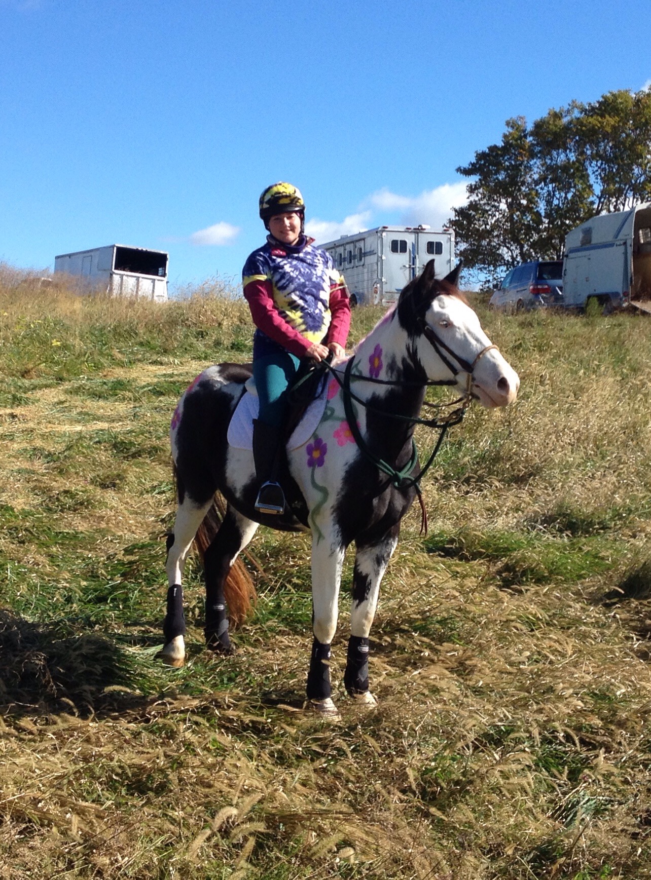 Val and Zoe met up with me, and we rode out together after getting our 70’s on. Half of the points for the final obstacle were decided on if rider and horse had on three visible 70’s items. We planned ahead and borrowed a set of tie dyed matching t-shirts and helmet covers from the Old School team gear, and Val brought paint which she and Zoe applied to our ponies in the form of flowers and ying yangs. We looked good. Other riders had on giant wigs, flowers, big sunglasses, and peace signs, not to mention tassels and fringe!!