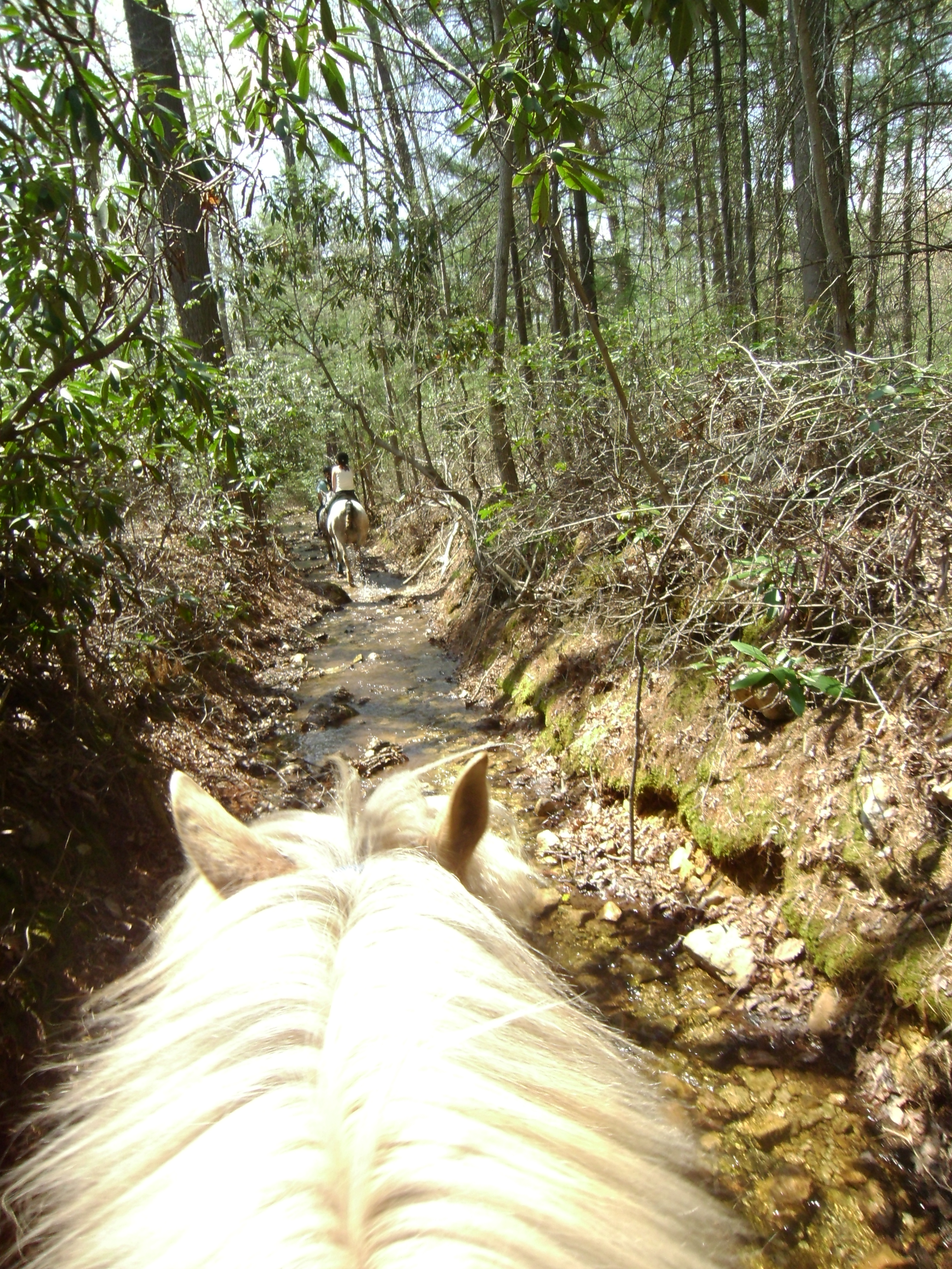 There were a lot of “do not belong” things in the woods, like small concrete buildings, painted water hole heads and foot bridges. I rode Simon across a pretty neat foot bridge. He is such a trooper. We also crossed several smaller bridges and enjoyed splashing in several creeks. Yoshi was splash queen. Sara also showed her experienced seat several times when Yoshi leaped into creeks from the banks, tripped in her splashing delight, and when she did a crazy deer hop over a fallen log.