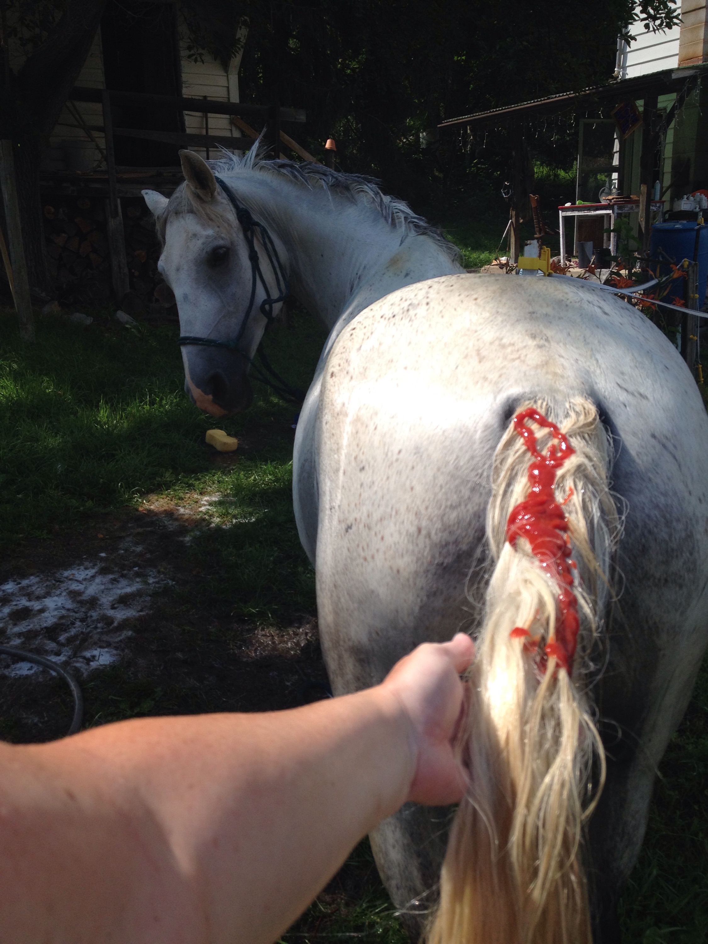 Have you seen this thing going around on social media about putting ketchup in a horses tail to help make it whiter? I kept seeing it and I decided to give it a try. I actually did two trials.