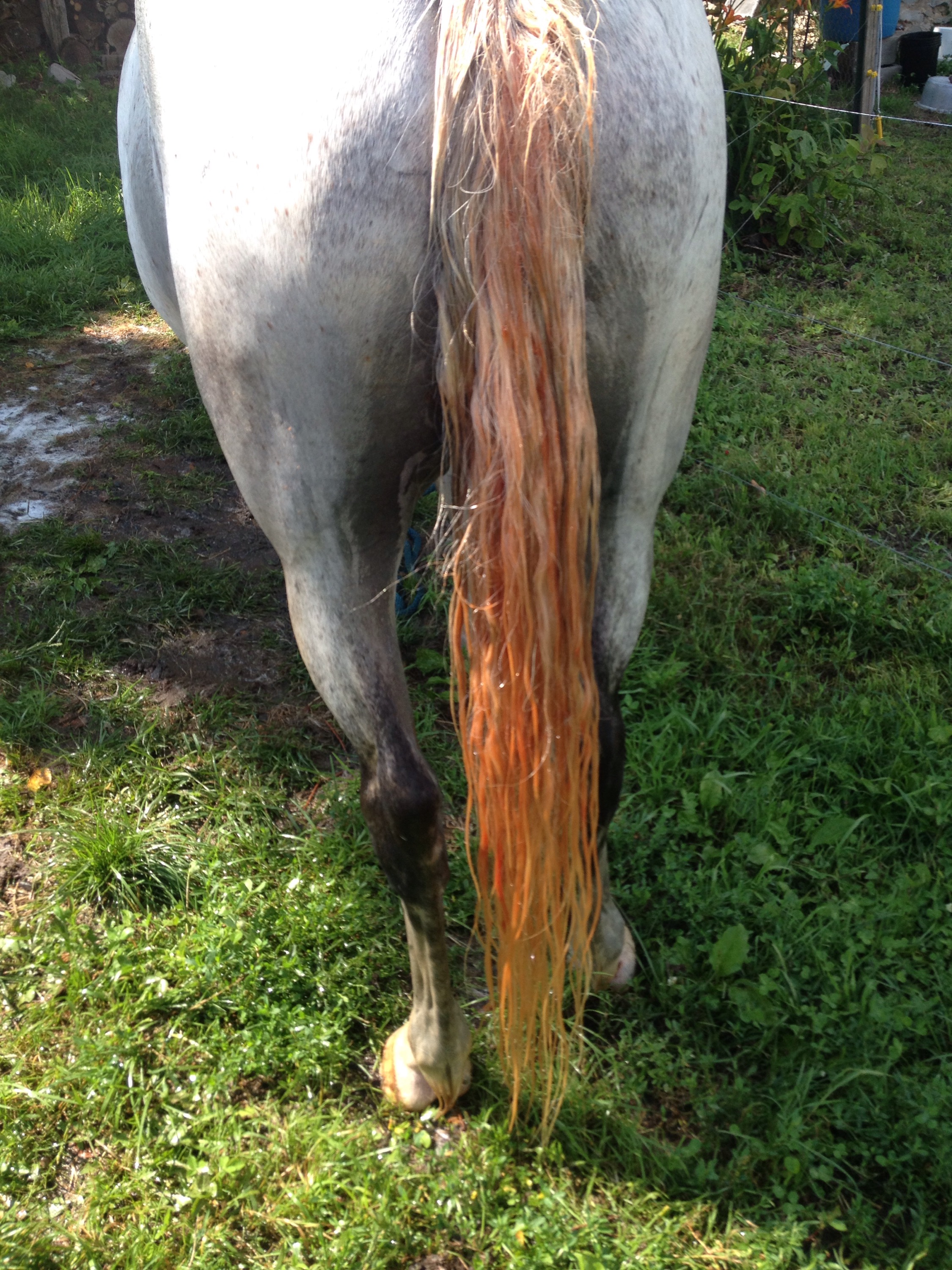 I had also decided Simon needed a bath so I figured, why not try it again. I have given Simon plenty of bathes so I will know more easily if his tail looks whiter. Like with trial one, I washed his tail out with equine shampoo, rinsed, and then applied ketchup liberally. This time I let it sit for closer the seven minutes before washing it out. I brushed his tail out and let it dry.