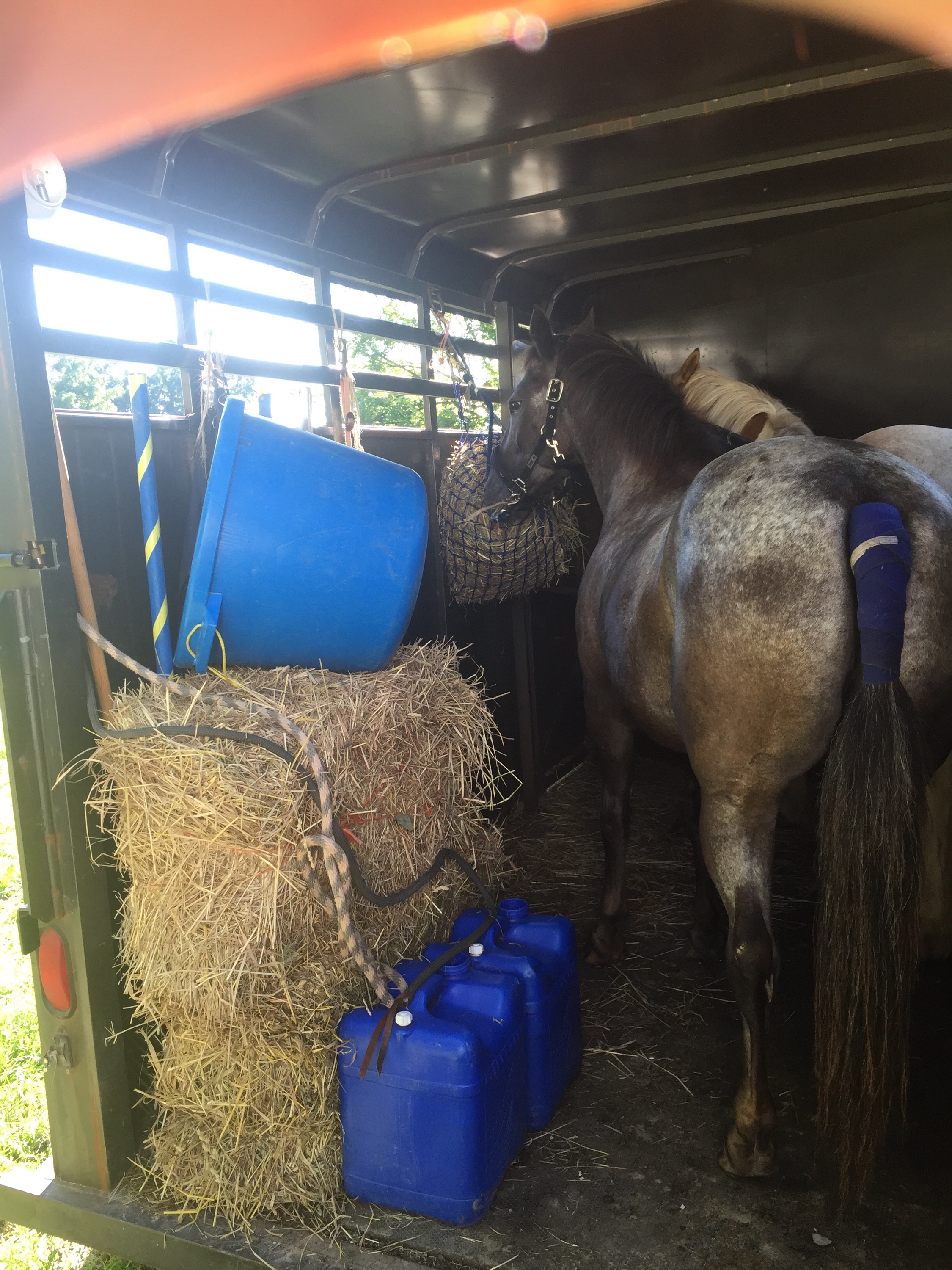 This is the view of my trailer just before heading out. Simon gets the small space up front, and Poe has to share his big space behind the divider with supplies.