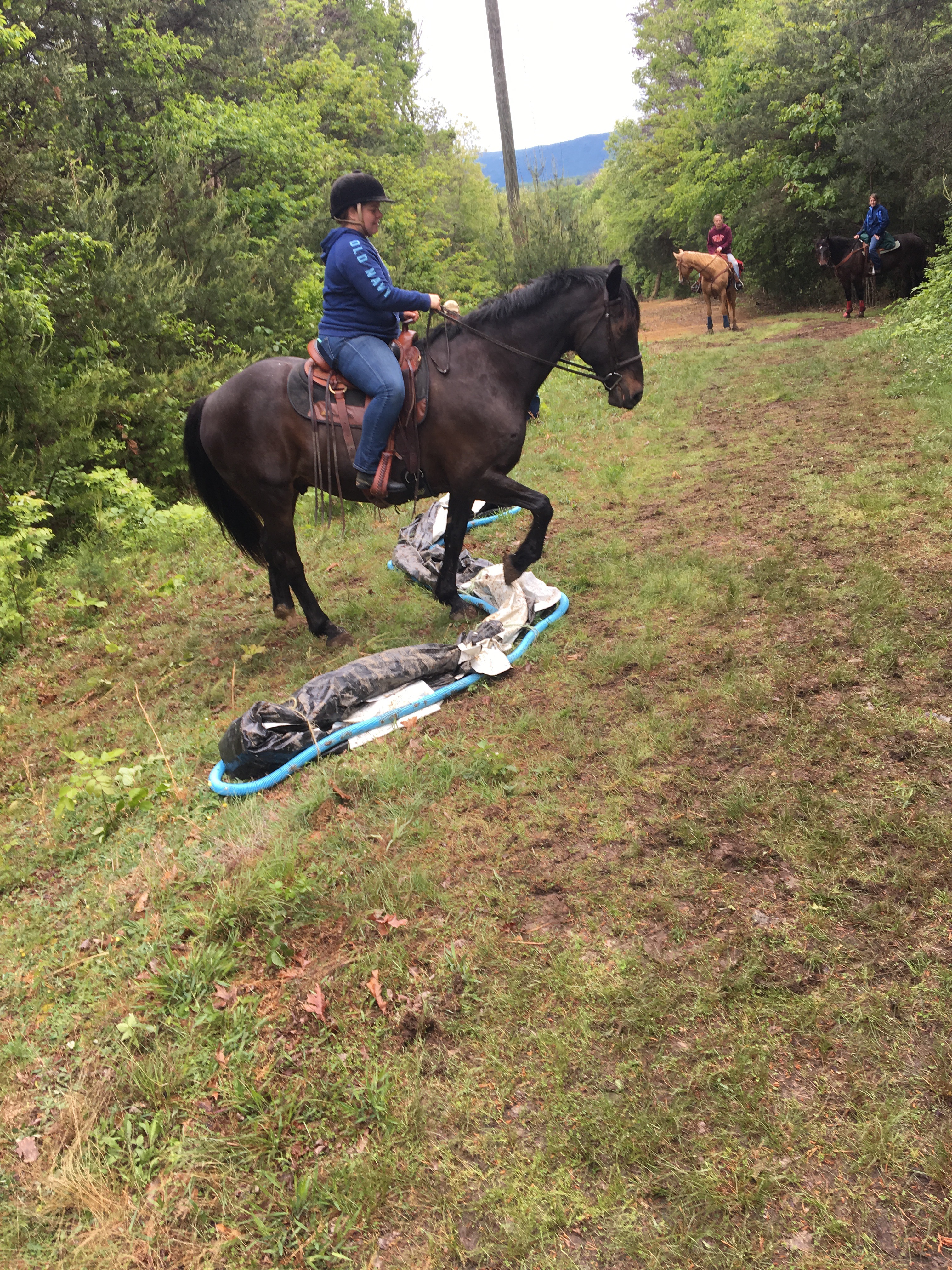 Andrea backs her big ol beast, Quin, up the hill through the wig wavy poles.
