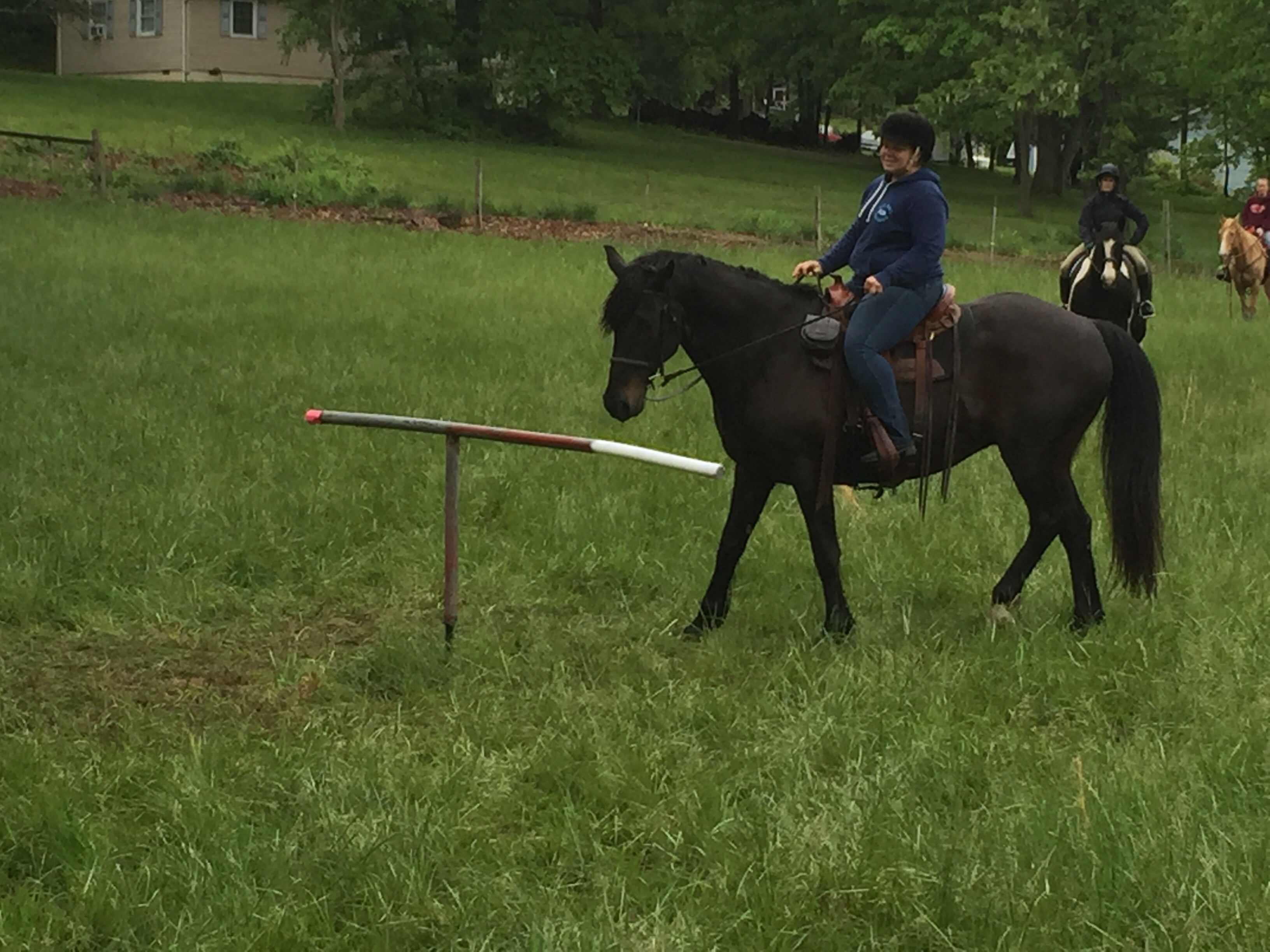 Lacy rode Gunner, her gorgeous Friesian cross (Tb I think). She beasted obstacles.