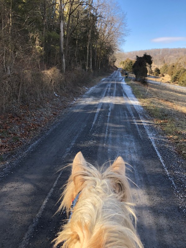 Two days ago I went out on a road hack and Simon was in one of those afraid of everything moods. So after two miles of two fists full of mane I turned around and we power trotted back.