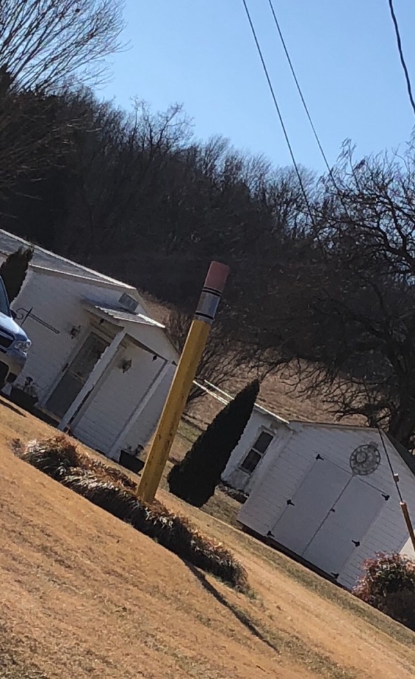 After we got into the more open he relaxed more and we were able to move out more which also burned off some of his nervousness. So I did get two quick shots of our view. And also a quick shot of this giant pencil in someone’s yard. I love that pencil.