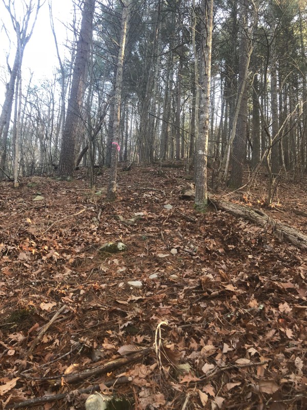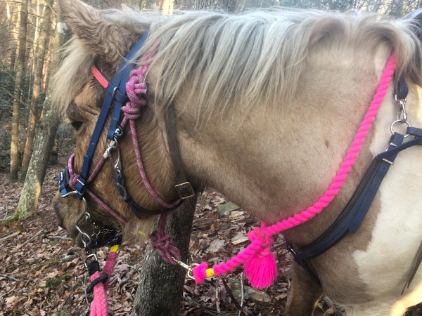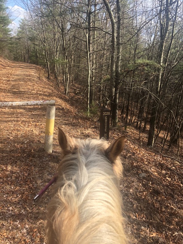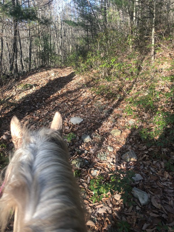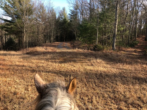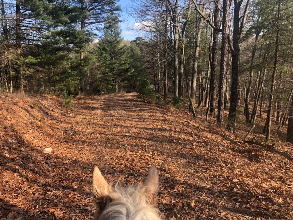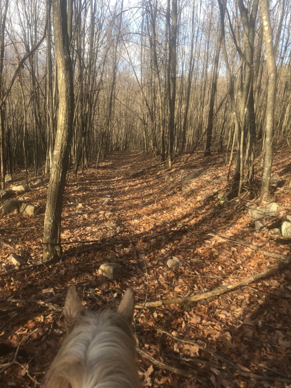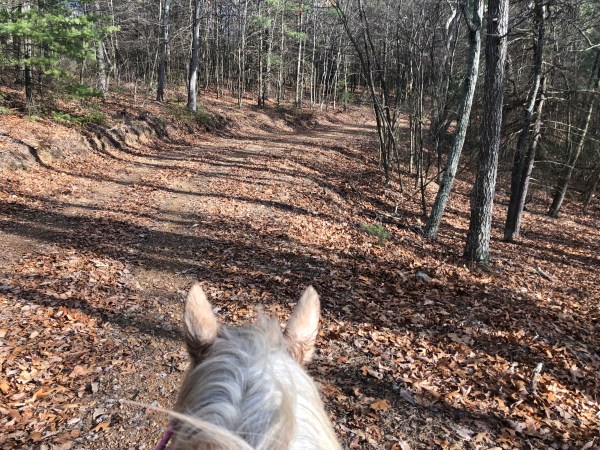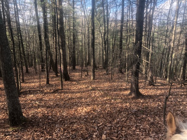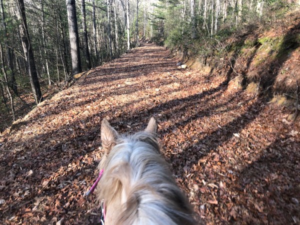 Here is where the real challenge comes. The downhill. The trail sort of narrows down and becomes less clear. There are pink marker tags here to assist with the hill, I recommend following them. It starts off not bad, going straight ahead and then curving to the left and beginning to slope down. It’s gradual but quickly gets steep. I have gone all the way down mounted, but I usually dismount once it gets super steep. Although I have mentioned previously I really am uncomfortable going steeply downhill on Simon so I am not sure how much of that plays into it, but I assure you, it is steep. The trail is visible, although the markers make it easier to follow, especially once on the ground.