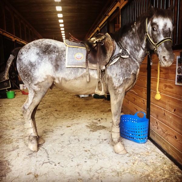Saturday night after we were well asleep the rain came back in force, and hounded down. It stopped shortly after the day got started. Not before we were all soaked, but early enough that we were not out in it all day. But the damage was done to the ring. It was soup. Concrete soup mix. The ring there just does not drain. And they added kick boards around the edges a few years ago which just sealed it in even tighter, which leaves a good few inches of water sitting on top of the still rock hard footing. It’s gross. And it layers on and sticks to everything like plaster.