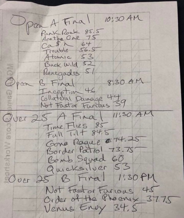 But let’s back up. Both the Open and O25 divisions had over 8 teams (the max amount of lanes that can be run in one heat) entered, 10 for Open and 9 for O25, meaning we had heats to run for those two divisions.