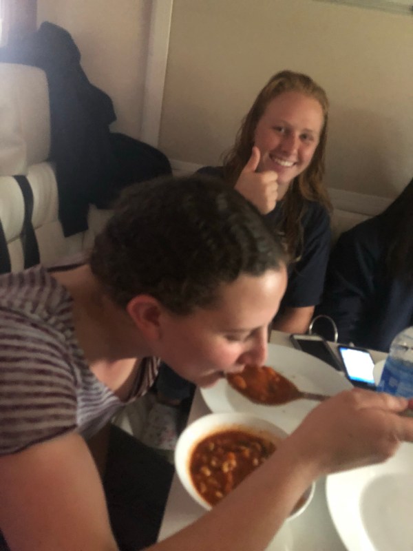 The camper came equipped with dishes and cookware but now that it’s time to eat we can’t remember where the utensils are. So there was a little improvising necessary. (Emma is using the giant cooking spoon to eat her soup).