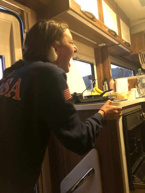 The oven is tiny so it takes a lot of rounds to make dinner. Emma is cooking tonight.