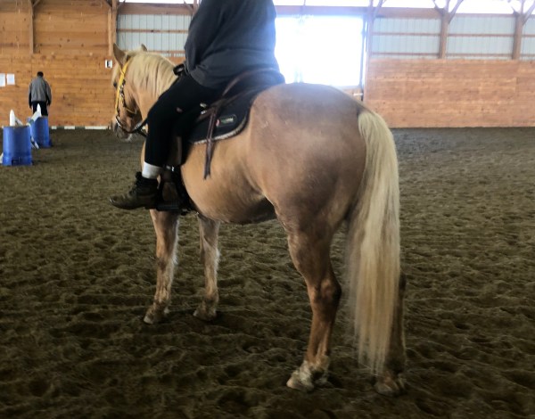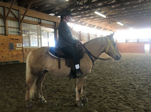 This weekend we also popped him over a small jump, you know, just to see if he jumps. Val was the brave one of us non-jumpers to give it a go. We do not suspect he is an actual jumper, but he was ok with it. Just like everything else asked of him. I felt like he said “you realize I have to go over that if you want me to go that way right?” and then “Well ok.” and over he went.