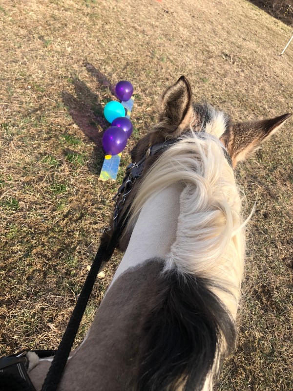 Possum is the first pony I have had that second guessed balloons. I’ll take that challenge. Today we got in a nice ride and included balloon work in it.