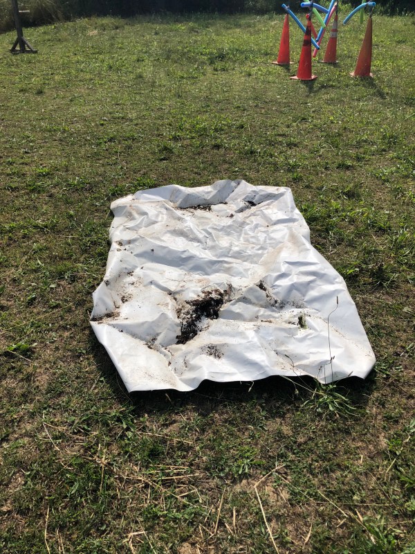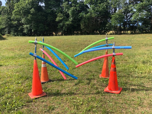 Finally I set up a flashy version of three pole mug shuffle. On the first pole I taped aluminum chafing pans. There was a minor breeze and lots of sun so they wiggled and reflected light. Possum gave these a healthy inspection but not showing any fear, just interest. On the second pole I taped four pin wheels. These also reflected some light and of course spin with the breeze. Just like with the first pole, Possum checked them out, liberally nosing them but other than interest he showed no care. At the third pole I attached a string and ran it to a super tall cone. The string had pompon like streamers hanging from it. Possum was interested, but just like the previous two poles he was simply curious.