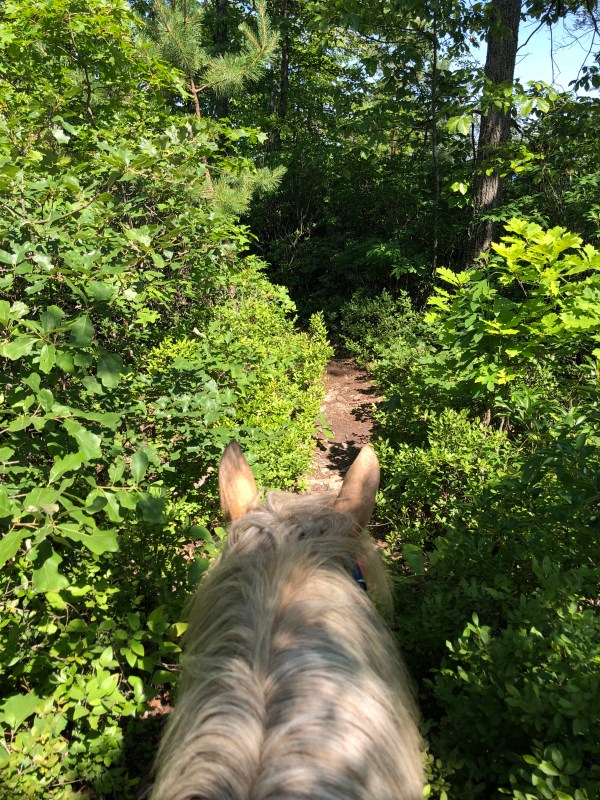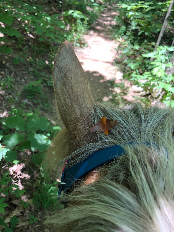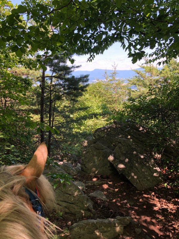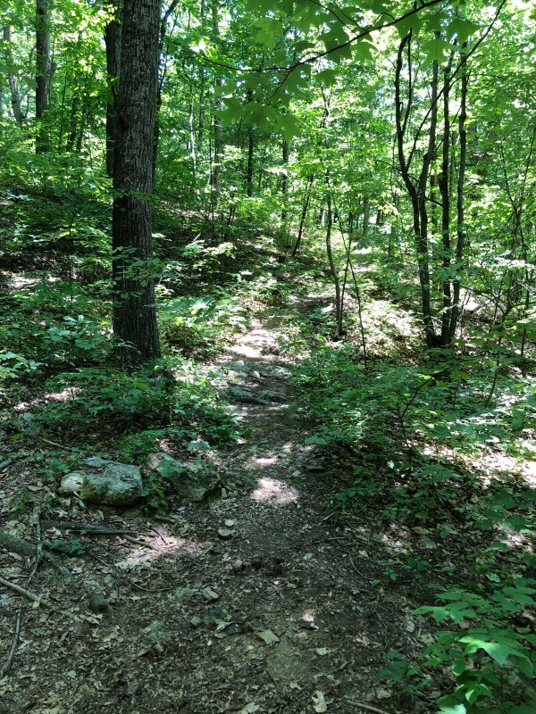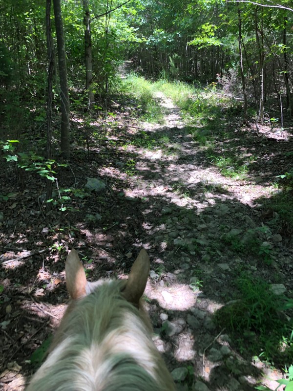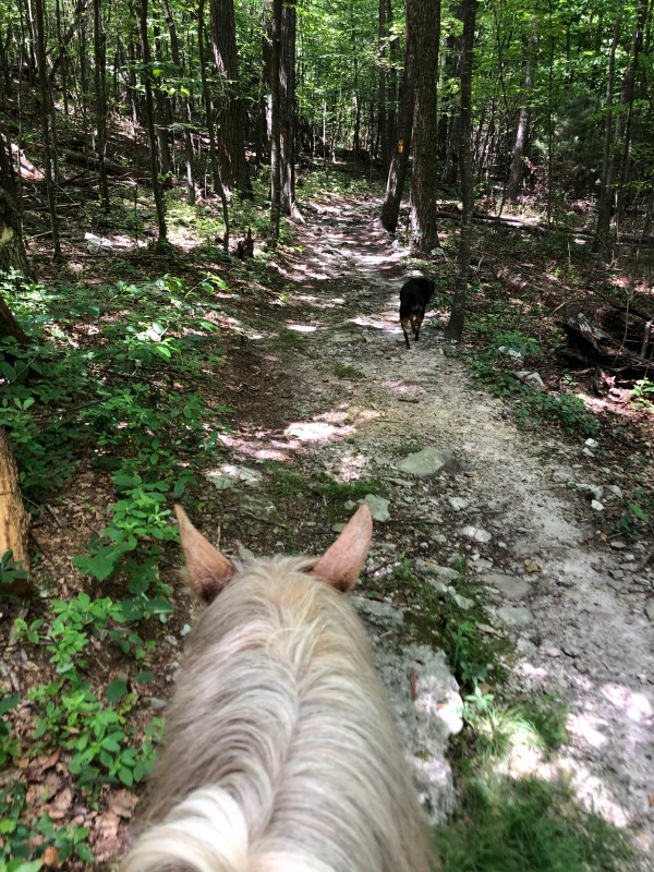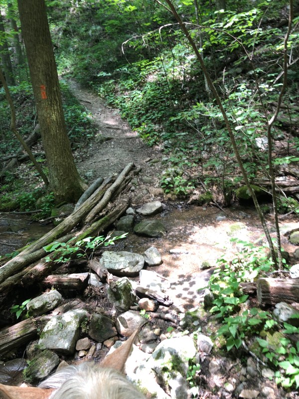 I took the right hand track into Massanutten Trail 408 (note how unhelpful the trail signs vs the trail map are at matching up). It is a decent although challenging hiking trail. And I checked the map that it is a multi use trail and open to horses. It is. I consider this portion of the trail to be a much more advanced riding trail. Some portions were narrow with drop offs and with an abundance of knee knockers, often at the narrowest points. There were some big jump ups and some extended climbs to navigate. Simon’s a good little climber and he kept his footing nicely on the narrow sections.