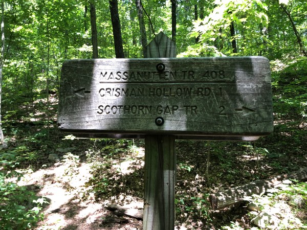 Eventually the trail makes a left hand turn, following the white blaze. Shortly before the two mile mark the smooth trail of 410 turns into more of a mountain track. And shortly after that this trail comes to a three way junction and orange blaze of Massanutten trail 408.