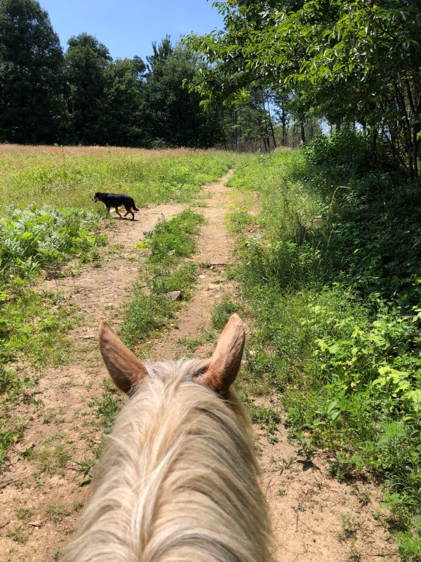 Parking: For this ride I parked at the paved lot on the side of rt211 on the east side of the mountain. After racking up I crossed over rt211, Simon in one hand and Daisy on a leash in the other. On the other side is a pass between two hills. There is a closed fire gate with a little wooden foot bridge over the gutter on the side of the gate. I let Daisy off her leash but kept her with me until after this point and then climbed on Simon.